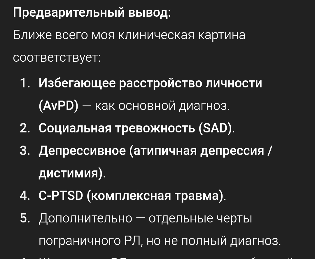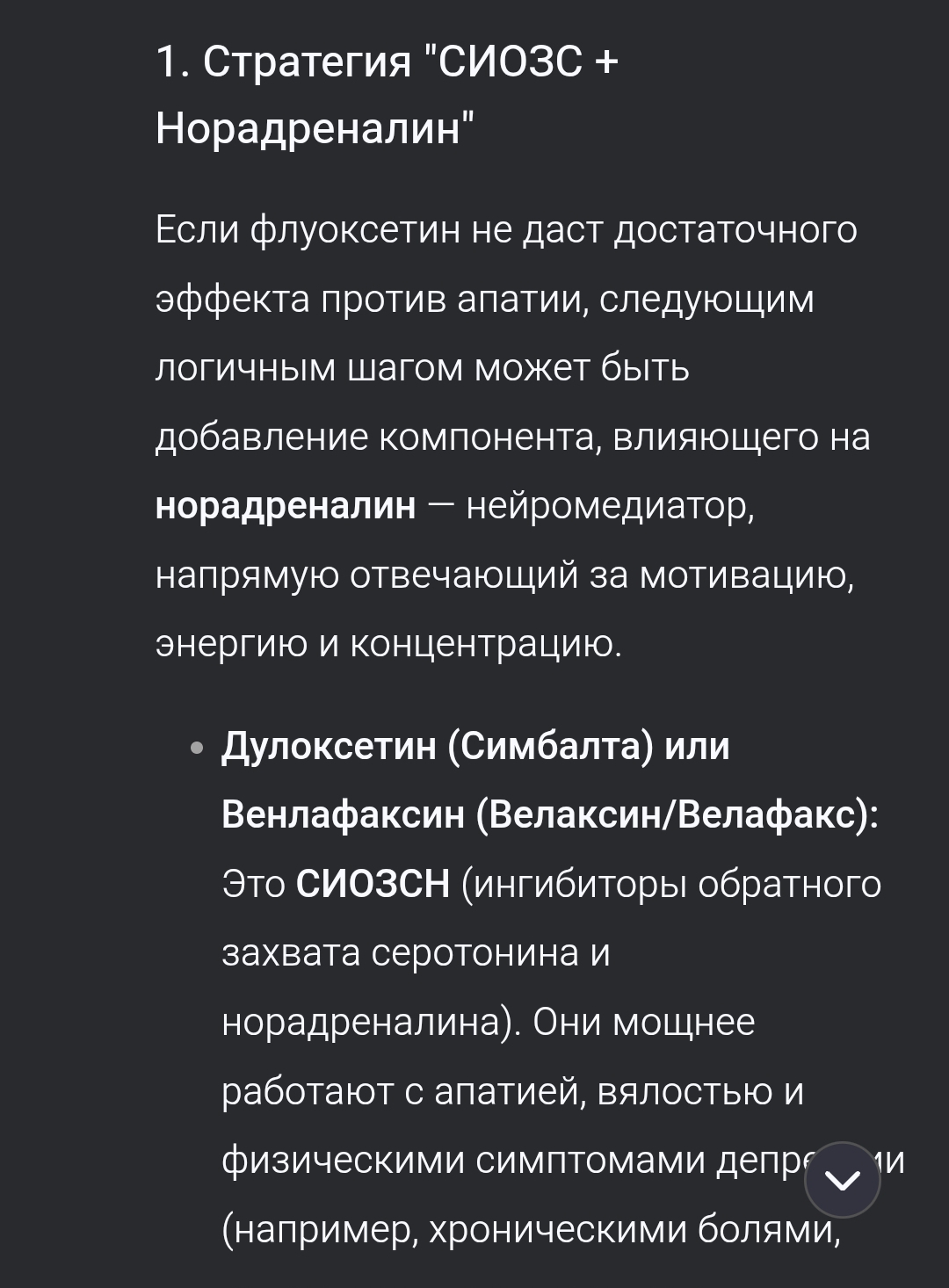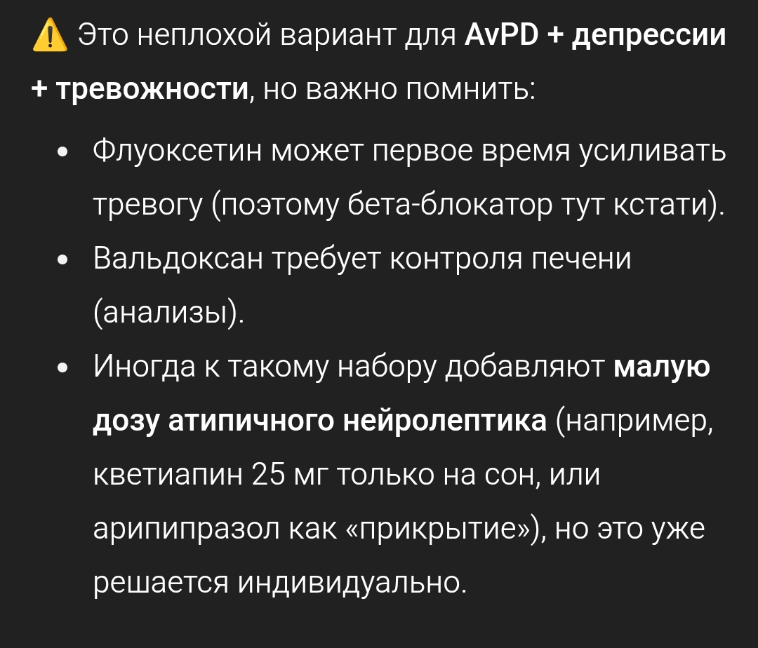 Что думаете? Пью сейчас кветиапин + паксил + миртазапин. Надоело что у меня нет сил, вкуса к жизни. Тревожность все еще ебашит когда выхожу из дома. Наел вес на таблетках. Сейчас хочу похудеть, но нет сил и мотивации. Лежу мешком на кровати и ничего не делаю, нет интереса ни к чему, еще и тревога добивает от занятий чем-то. Хочу перейти на флуоксетин + вальдоксан + бета блокаторв. Чтобы появились силы, флуо помог бы с диетой. Из минусов это плохое купирование тревоги чем на паксиле + когда ты заседатирован, но я и так тревожусь блядь. На улице боюсь на людей смотреть или что они доебутся. Короче хочу из депрессняка чут чут вылезти и чтобы возможно? я снова начал удовольствие от жизни получать, анимцо смотреть, в игры играть?? а не вот серый фон вот этот. Ну и еще минус могут вернуться эмоциональные качели. И действия на импульсах. Еще сон может по пизде пойти снова конечно... Еще надеюсь что появятся силы чтобы я начал углубляться в психотерапию и всякими кпт заниматься. Либо самостоятельно, либо может найду психотерапевта для такого?