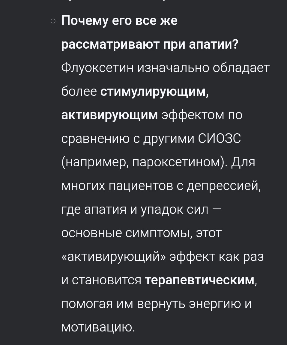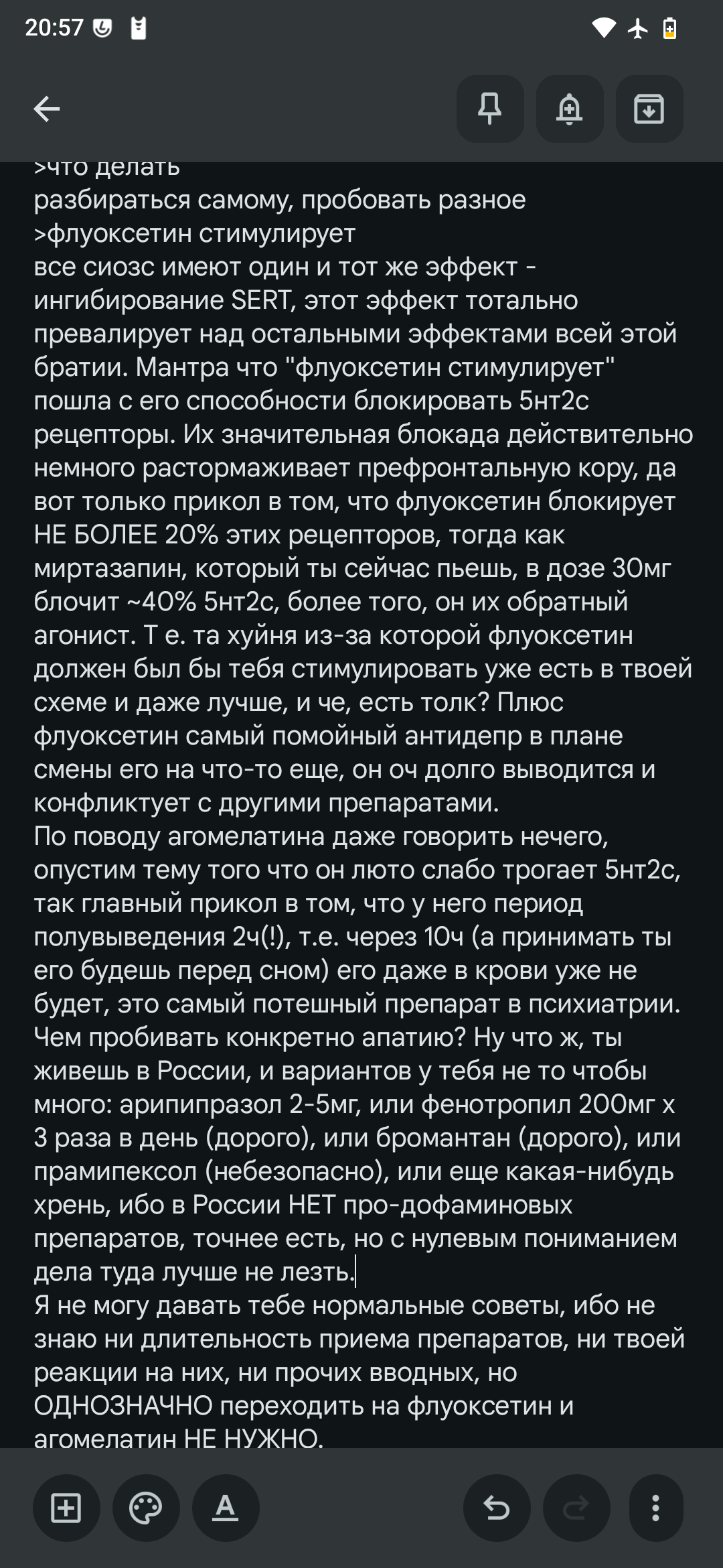>>1880198 > нейросети это последнее, что стоит слушать по поводу подбора терапии А что тогда делать? Тут сидят торчебосы в основном, либо впадлу людям писать. Но я понимаю, мне бы тоже было похуй, но че тогда читать? Как разбираться в сабже. Да и сил нет. Когнитивка на нуле. Нейронка легкий вариант хоть с кем-то обсудить проблемы. Когда прихожу к психотерапевту сразу сковывает и я ни бе ни ме, че спросить не знаю, он тоже не развивает диалог. Что предложить ему тем более хз. А он как-то поверхностно ко всему относится, не знаю. Надо что-то иметь заранее чтобы я пришел и предложил какие-то таблетки и обсудил их > Агомелатин это вообще ребрендинг мелатонин, а флуоксетин даже в теории не может помочь от апатии и тем более эмоц.уплощения, ведь ОН ИХ ВЫЗЫВАЕТ Пикрил. Насчёт мелатонина, мне нейронка и советует сменить миртазапин/квет на что-то что влияет на циркадные ритмы. Потому что эти препараты меня жестко вырубают и не помогают режим наладить. Когда я пропускаю прием то все, бессонная ночь, сплю днем. Плюс квет уже на толере и хуже работает. Ну и я хочу уйти от препаратов с побочкой в виде лишнего веса