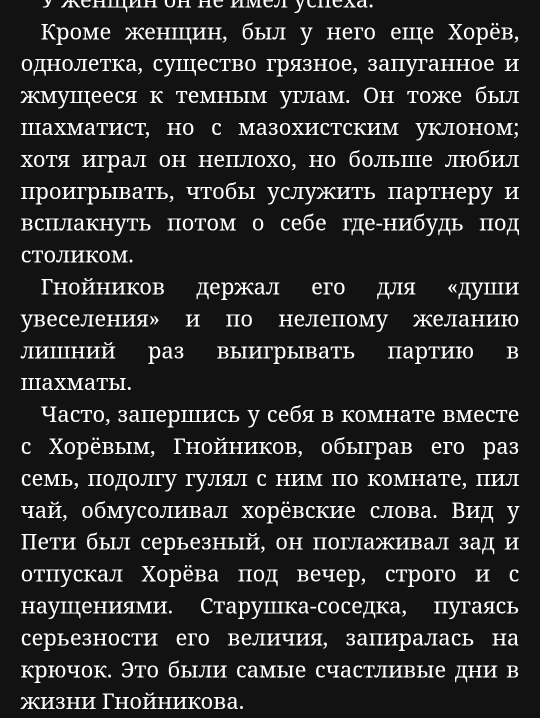 > О, мы общались каждый день, почти полгода мы делились друг с другом вообще всем, у нас почти что была одна жизнь на двоих. Я знаю, о чем вы подумаете, но я даже не фантазировал о ней, максимум, об обнимашках. И вот, когда никто не тянет меня за язык, я рассказываю нечто, что заставляет ее оборвать общение. Я так провёл 10 лет жизни. До сих пор помню их имена и города. Ни одна тян из моего города или просто хотя бы из крупной агломерации, — таким такие как я, безобоазные "в мантии возвышенного" — не нужны, у них обилие контактов ИРЛ, которые выше неё по статусу и достатку. ИРЛ другие люди. Те, что обитают там, никогда не станут общаться с такими как мы. Всегда всё, однако, заканчивалось осквернением: нож в спину, иногда в сопровождении вскрытия грязных фактов. Я пописал в гроб. Мне смешно. Теперь я так делаю всегда.