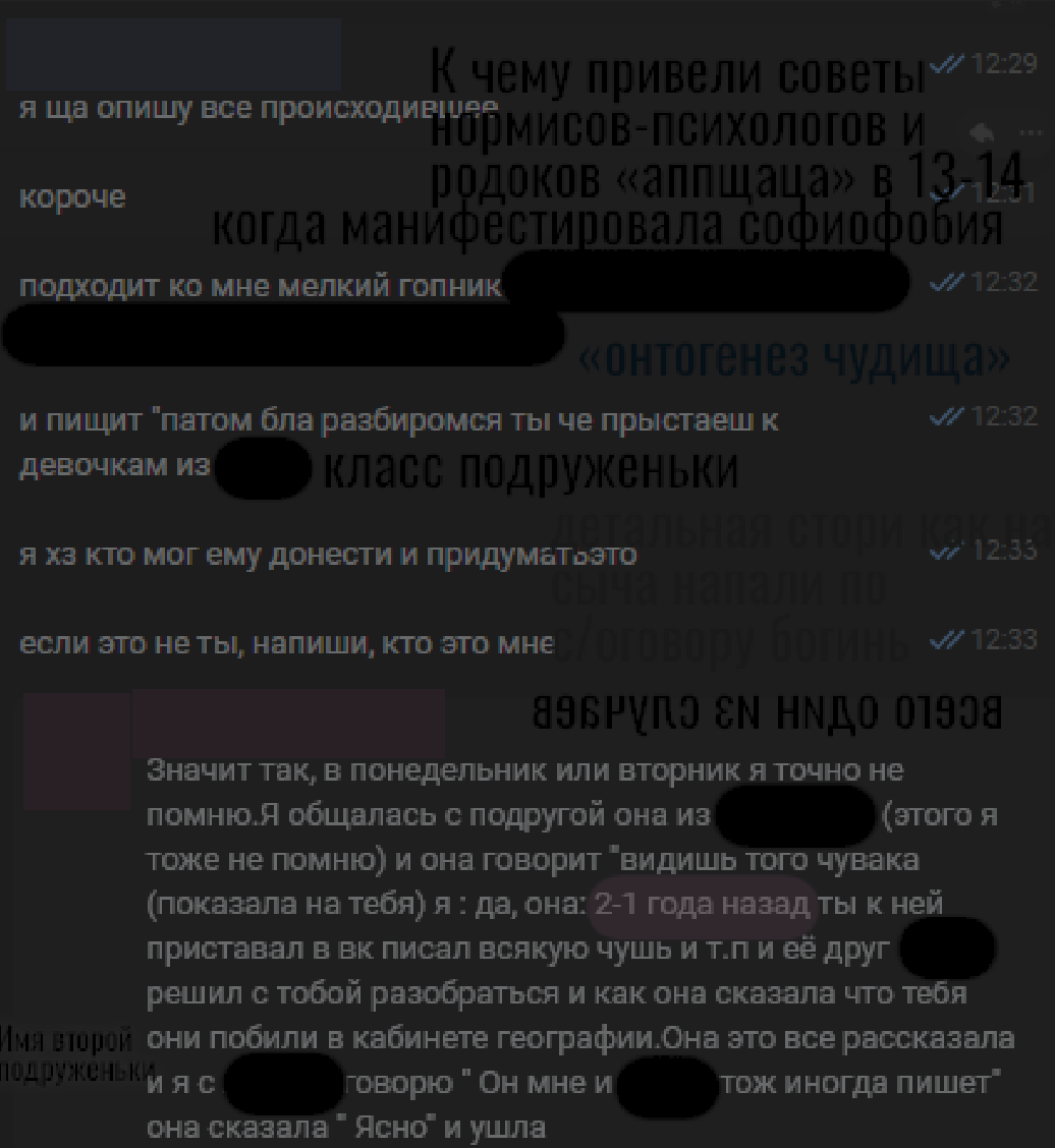 > И вот, когда никто не тянет меня за язык, я рассказываю нечто, что заставляет ее оборвать общение. ????? Это что такое? 1) Тебя принимают не полностью, значит вы несовместимы или человек тебя предал. Я вот друга принимал любым — так и должно быть. Другие люди не нужны (ну только как инструмент - для того же внимания) 2) Ты типа че, рассказал что тебе делали цистоскопию? И ты считаешь нормальным если после такого бросают? 3) Это просто предлог 4) Ты НИКОГДА не должен компрометировать себя. Никогда, ни перед кем кроме матери и отца. 5) Ты должен уметь контролировать пиздак у иметь захлопнуть его и остановиться если от эмоций моча в голову ударила. 6) Есть леваки которые считают что убивать за слова нормально. Таких - сразу нахуй, просто без вопросов. Например, если человек считает порочным что-то, что есть в тебе. Например, так может кинуть фемка если ты скажешь что татухи делают шлюхи.