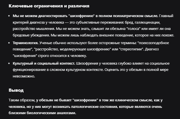 Вот я спросил у дипсика бывает ли шиза у приматов, он говорит что мы не можем диагностировать не то что шизоидные какие-то расстройства но даже такие состояния как шизофрению. Переломы есть? Ушибы есть? Орз есть? А шизиодности нет, а знаете почему? Вот и думайте.