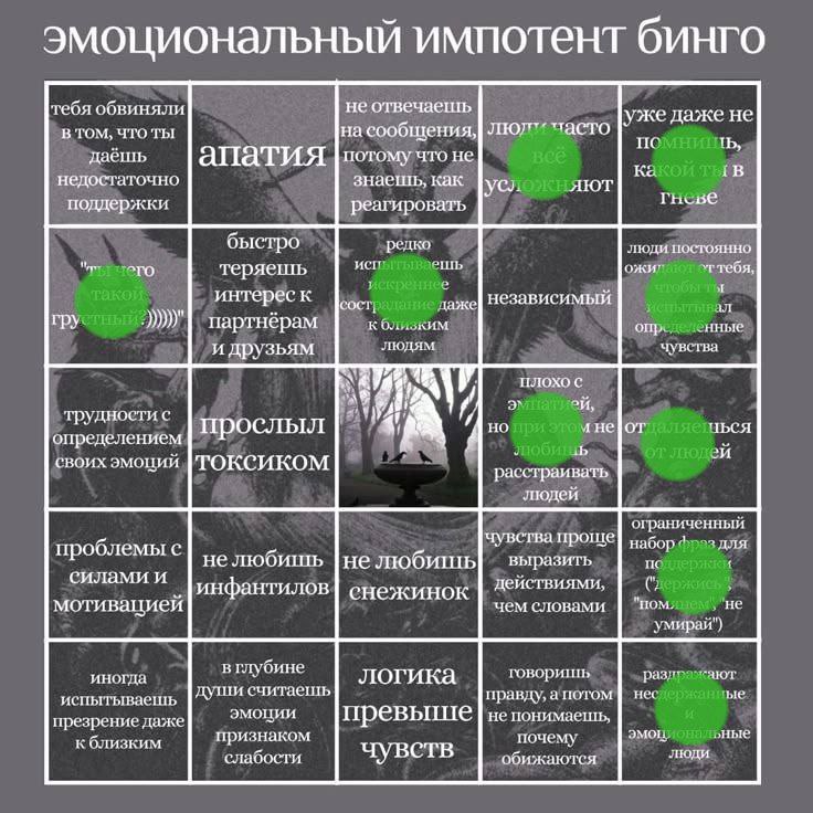>>1898986 >ну не могу я просто жить без задней мысли о том, что я меня откритиковали Контрзависимость заключается в отказе от привязанности и отрицании или подавлении чувства нужды в другом человеке. Страдающие от контрзависимости всеми силами избегают ситуаций, в которых они бы хоть в чем-то зависели от кого-то или нуждались в ком-либо. В центре контрзависимости лежит неумение доверять.