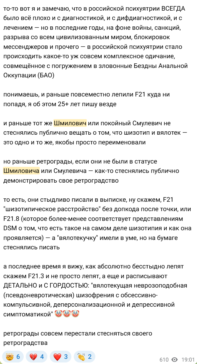 Ага. И она говорит ПОЧЕМУ они ГОВНО. Потому что в один момент ты гордый человек с нарцисическими чертами - но тебя закенсилили в твиттере за кринжовую шутку. Ты декомпенсировался. ВСЕ у тебя расстройство. Или ты 8 лет был крутым преступником. Попался. Словил от этого дистресс и дезадаптацию - получил диагноз. И она говорит что оценка по РЕАКЦИИ ОБЩЕСТВЕННОГО МНЕНИЯ для постановки диагноза это БРЕД.