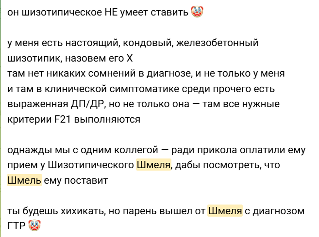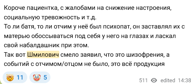 А знаешь кто это кидал? Это кидали в чате ДРУГИХ частников. И это клиника ШМИЛОВИЧА, которую все коллеги срут трёхэтажными кирпичами. Некоторые даже его диагностировали, ЛОЛ
