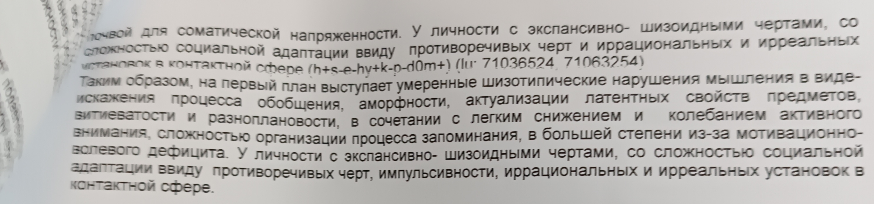 А бляяяя... карточка с шубой на котором нормальный человек по идее ответа не должен давать ответа но... почти всегда дают. Это карточка ловушка. И на неё по идее дают ответы только шизофреники (почему тебе и записали шизотип). Причем очень часто экзаменаторы сами давят на то, что ответ есть прося подумать. Причем в оригинальной методике этой КАРТОЧКИ НЕТ. Она вообще выделяется из всего антуража.