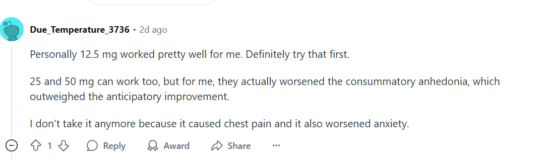 >>1890848 Кого-то с 1 акатизит, кто-то и с 7.5 нормально себя чувствует. Вроде с точки зрения теории для депры 5 максимальная доза, дальше идёт плато. Короче, подбирай и потитруй. Учти ещё что арик выводится неделю, поэтому может быть накопительный эффект.