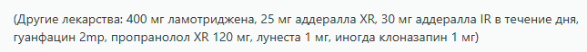 У меня нет сдвг (наверно), нет биполярки. Диагноз кптср. Ламотриджин вроде немного помогал, но я долбоеб думал что от него нет толку и дропнул. И теперь стало еще хуже. На днях начну пить опять.