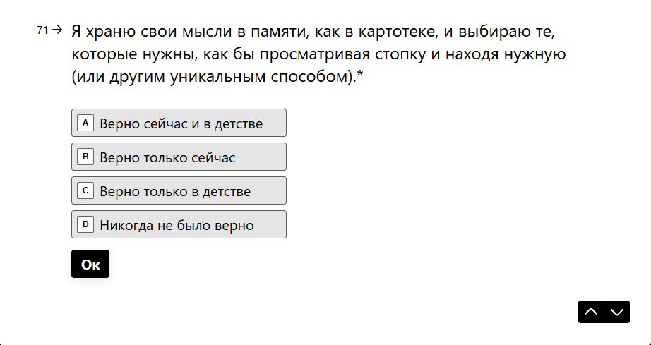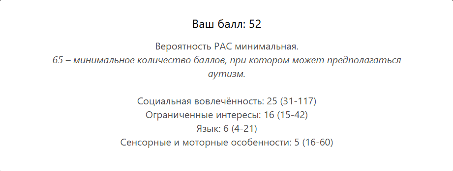 >>1895509 хз спорно. там вопросы в основном склоняют на то что если ты аутист, то ты безразличен к эмоциям других, не можешь побыть в чужой шкуре и любишь быть одиноким. А я в основном чувствителен, могу подумать за других, хочу влиться в компанию, но у меня проблемы с пониманием и автоматическим анализом и воспроизведении информации (это как раз про то что я не умею общаться с людьми, и вынужден накапливать темы, мемы в свою картотеку)