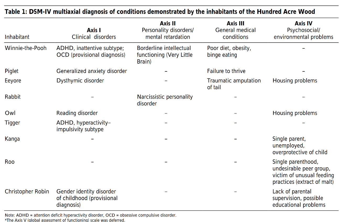 Диагнозы можно ставить даже выдуманным персонажам. Shea SE, Gordon K, Hawkins A, Kawchuk J, Smith D. Pathology in the Hundred Acre Wood: a neurodevelopmental perspective on A.A. Milne. CMAJ. 2000 Dec 12;163(12):1557-9. PMID: 11153486; PMCID: PMC80580. https://www.cmaj.ca/content/163/12/1557.long
