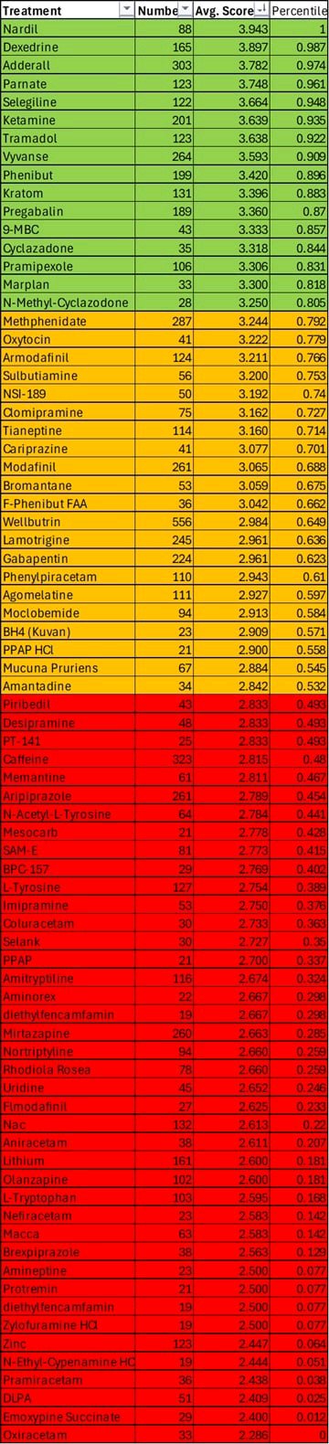 >>1897501 Ну вот, неча дедушку фенибута недооценивать, жрём за обе щёки. Это опрос с реддита про вещества, убирающие ангедонию. Намбер - это сколько человек ело препарат и, соответственно, голосовало.