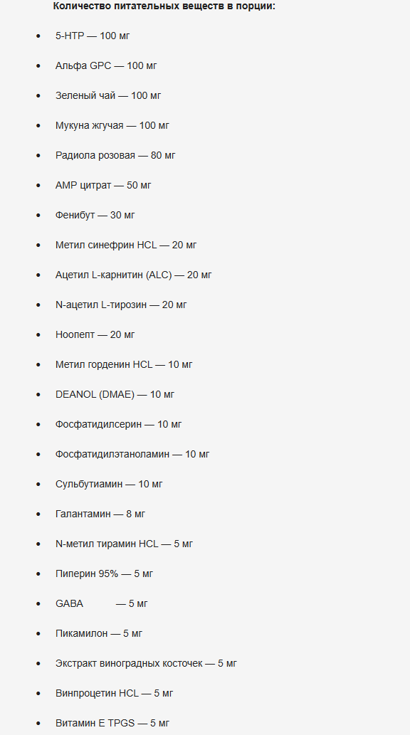 Теакрин - родственник кофеина, работает похоже, но заметно дольше Кофеин - все его знают, все его любят Бакопа - ноотроп, вроде, помогает с памятью 2-аминоизогептан (DMHA) - уже написал, полузапрещённый стимулятор, доза вроде средняя Ацетилтирозин - хитрый прекурсор дофамина, может какой-то позитивный эффект давать, но леводопа мощнее (и тошнотнее) Фенилпирацетам - всем известный фенотропил, несколько стимящий ноотроп, можно так купить Ашваганда - любопытная травка со свойствами, которые надо изучать. Кстати, её пока не осписочили, но объявили нежелательной, сложнее так найти стало Гинкго Билоба - травка со вроде бы ноотропными и успокаивающими свойствами, вряд ли сильная Альфа ГПЦ - писал L-теанин - успокаивающая аминокислота, компонент чая. Рекомендуют пить с кофеином чтобы стимулировало, но не трясло. Про недодоз писал. 5-HTP - писал Мукуна - про леводопу писал Горденин - писал Фосфатидилсерин - вещество вроде бы с ноотропным эффектом Ноопепт - писал Птеростилбен - брат ресвератрола, вроде какая-то польза здоровью есть, но вряд ли сильный Экстракт корицы - наверное вкусненько Экстракт винограда - наверное вкусненько Нарингин - только услышал, но польза здоровью вроде какая-то есть Витамин Е - полезно, но скорее при недостатке Пиперин - вещество из перца. Вроде помогает некоторым другим веществам в составе усваиваться Винпоцетин - какое-то известное лекарство для кровообращения. Вряд ли сильное. Гиперзин - писал
