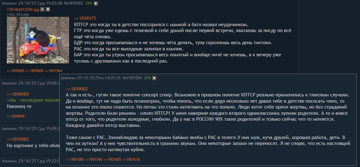 Как такие вообще сюда заходят, дорогу находят? Это же надо быть двачером, потом нужно знать что здесь есть ещё доски кроме b и pol, потом ещё нужно в голове думать что ты мудак какой-то не такой жопу трогаешь рукой, и потом найти тред по кптср. Такая длинная цепочка событий заставляет меня думать что проблемы действительно есть, ну не будет здоровый человек так притворяться ради внимания и гавваха. Либо это из других тредов набежали нарциссы. Здоровый человек пойдёт в тикток и будет собирать гаввах там на модном и выдуманном заболевании.