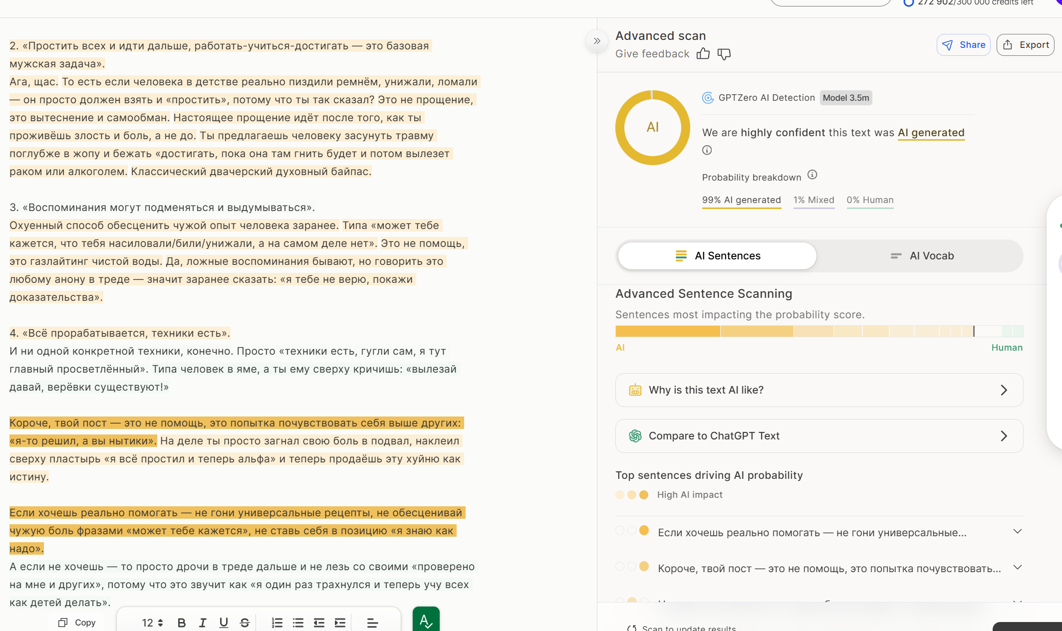 >>1905675 Как же гоев греют этим переобученным говнищем. Достаточно было убрать нейросимволы, и предложения с параллелизмом, и текст уже на 77% точно написан человеком. Как я рад что люди друг другу ебут мозги этим калом. Бедные студентики теперь боятся использовать кавычки и эмдаши, из-за того что людишки считают что ии это плохо и проверяют текста переобученным ии. Людишки должны старадать.