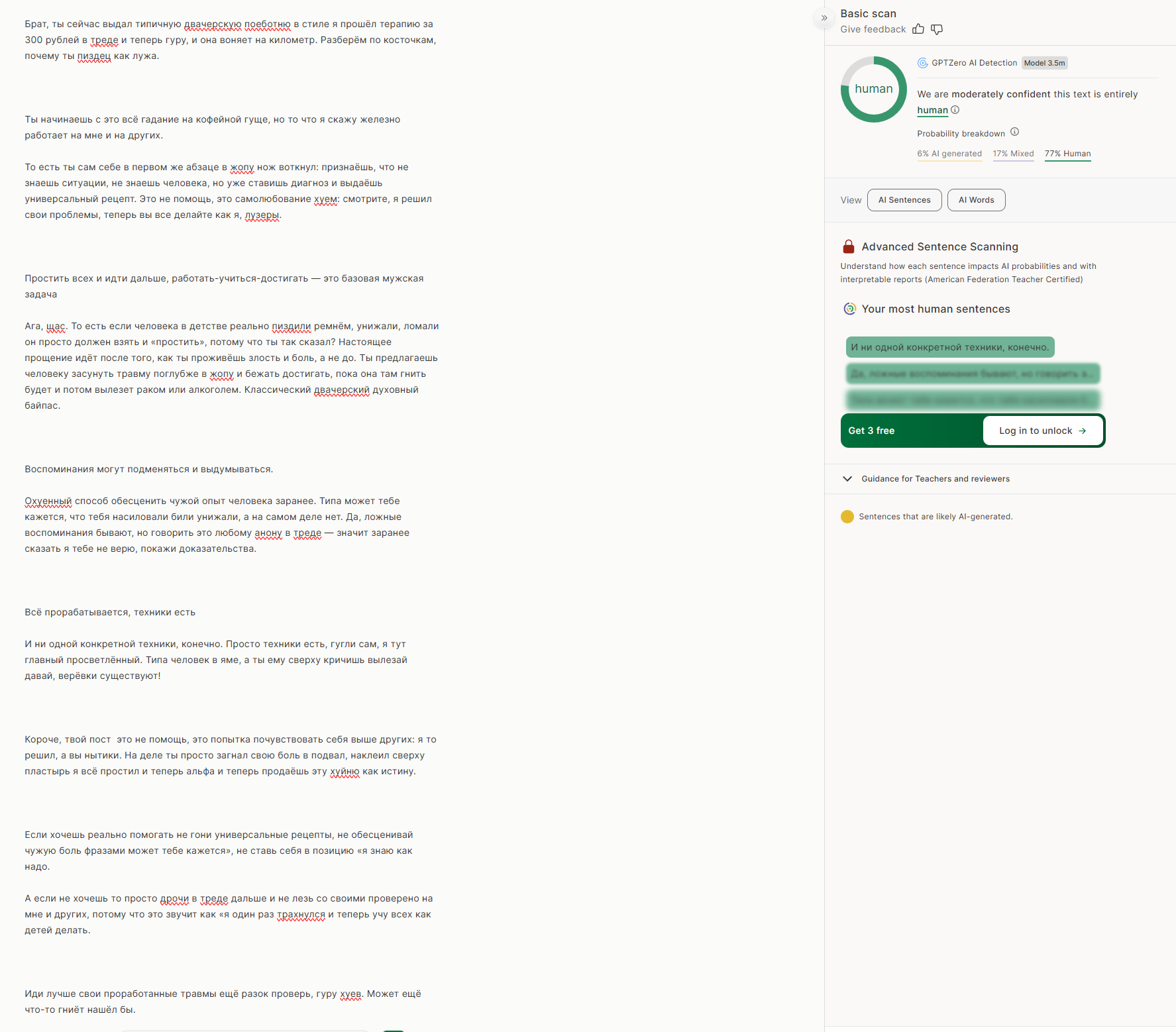 Короче, твой пост — это не помощь, это попытка почувствовать себя выше других: «я-то решил, а вы нытики». На деле ты просто загнал свою боль в подвал, наклеил сверху пластырь «я всё простил и теперь альфа» и теперь продаёшь эту хуйню как истину.