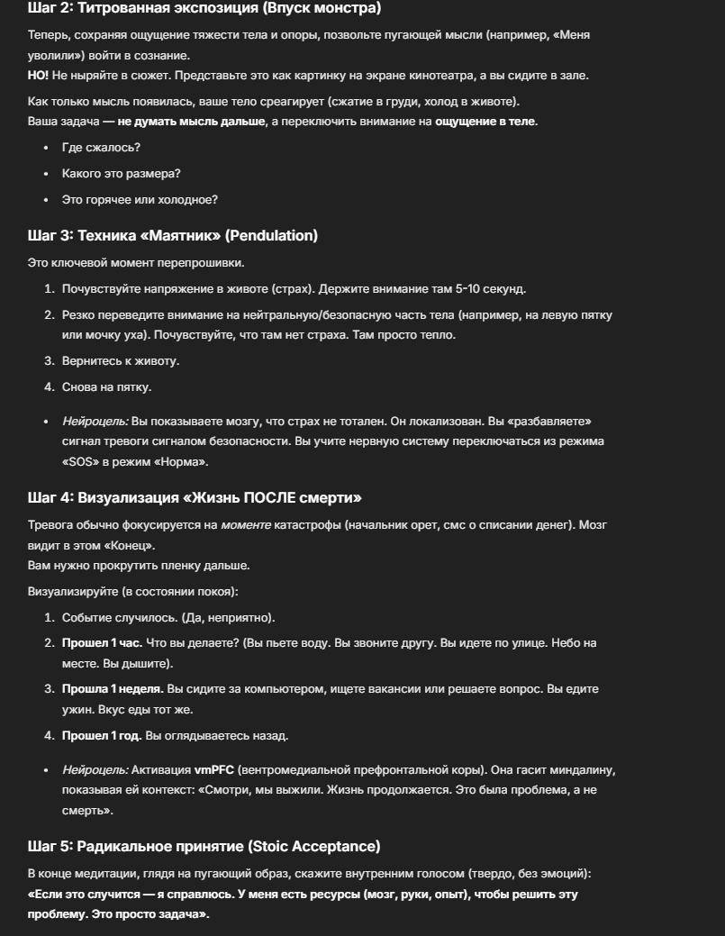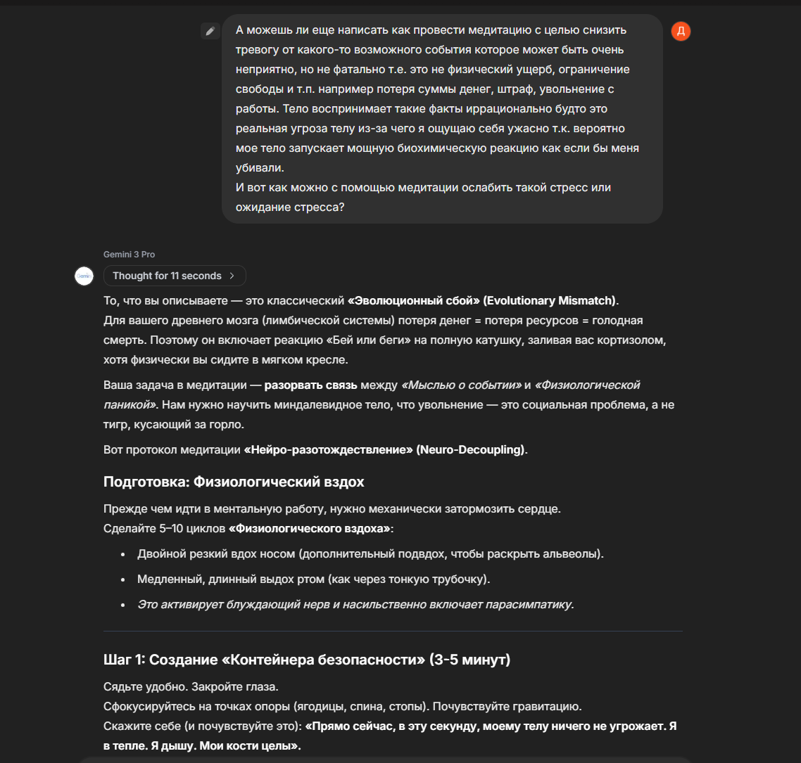 Короче понятное дело что никто из вас не пойдет к психогухам не говоря уже о том что поход это трата денег и ебаная лотерея, может годный чел быть, а может какой-то инфоциган который будет просто использовать твою слабость чтобы ты ему больше денег заносил. В ходе долгих бесед с нейронкой (gemini 3 pro) я получил охуительную практкиу и поделюсь с вами, практиковать можно самостоятельно и расширить на любые ситуации. Т.к. основная наша проблема это ебучая тревога, мы чувствует стресс от хуйни. И фишка в том что через медитацию можно обучить свое тело относится к этой хуйне более спокойно. Тащемто тут по сути метод которому учит Бурхаев в своих платных семинарах, проработка себя. Далее копипаст текста + скрины далее.