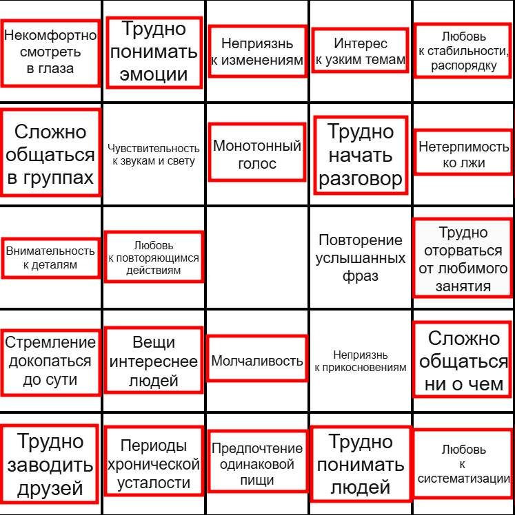 Общаться с родителями бесполезно, два алкоголика которым на меня было в достаточной степени похуй, поэтому оперировать только своей памятью. Никогда не был частью коллектива, никогда не был естественной частью группы, в которую кое-как пытался влиться через маскинг (подчерпнул этот термин из статей в закрепе, я всегда думал что это норма и это так работает у всех людей, а оказывается все должно проходить естественно и без того бешеного напряжения что всегда испытыва-л/ю я). Общения минимум на протяжение всего взросления и околонулевое во взрослом возрасте. Меня часто называли странным. Занимался ли я выстраиванием игрушек в ряд - тут хз, родителей, как уже упомянул выше, спрашивать бесполезно, там в черепной коробке у обоих уже проспиртованная жижа. Но зацикливался и зацикливаюсь до сих пор на онлайн играх, хз, может ли это считаться симптомом, и это обычно нетипичная форма игрового процесса (например, бустинг персонажей через репетативный соло-фарм данжа) и даже в онлайн играх коммуникация околонулевая. Есть звуки которые меня раздражают, при чем до мгновенного состояния бешенства, в основном это звуки которые издают люди по время еды или если это очень похожие звуки окружения. Про тактильно тут хз что сказать, могу только утверждать что тактильные взаимодействия с другими людьми вызывают у меня странный дискомфорт который я сам описать не могу.