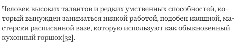 «Человек умный будет прежде всего стремиться избежать всякого горя, добыть спокойствие и досуг, он будет искать тихой, скромной жизни, при которой бы его не трогали, а поэтому, при некотором знакомстве с так называемыми людьми, он остановит свой выбор на замкнутой жизни, а при большом уме — на полном одиночестве. Ведь, чем больше человек имеет в себе, тем меньше требуется ему извне, тем меньше могут дать ему другие люди. Вот почему интеллигентность приводит к необщительности. Если бы качество общества можно было заменить количеством, тогда стоило бы жить даже в «большом свете», но к несчастью сто дураков вместе взятых не составят и одного здравомыслящего.»