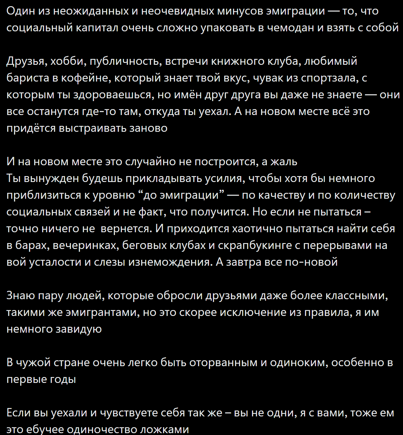 Встречался с тян, потом она съебалась от меня, когда пожили вместе пару месяцев (до этого встречались почти год, жили раздельно, но часто ночевали друг у друга). Перед тем как съебать она мне выносила мозг, что я дома ее не замечаю и она как мебель, потом уехала в родной город на месяц, и я тупо ушел в себя. Буквально не мог извлечь из себя каких-то эмоций, чтобы ей что-то написать. Она меня за это обвиняла, но я если честно не понимал тогда, как можно винить пустой колодец за отсутствие воды. Вернулась, мы разъехались, но еще прообщались, и в итоге она дропнула меня. А я то думал тогда, что люблю ее, долго страдал. После этого следующии расставания проходили более менее на похуй. Ни с одной не общался дольше пары месяцев. После целых двух лет изоляции недавно вышел в дв, там нашел тню, с которой было весело поболтать пару дней и вдруг я понял, как меня это гнетет и заебывает. Сам факт того, что кто-то условно находится в моем кругу, создавалось какое-то давление. И несмотря на желания тянучьего тела, зов плоти, я не мог себе представить, что даже останусь с другим человеком один на один на целую ночь без возможности съебаться. Ну в итоге мы как-то пересеклись, она со мной заигрывала, а я перед ней бухал крепкое пиво, рыгал, шутил, что она полная (хотя она не была жирухой), говорил, что мне нужна жена монголка или жена латино. В итоге она устроила потом разборку в переписке, даже что-то типо скандала, ну и мы не общались больше. Хотя на следующий день, после того как она меня блокнула в результате моего ахуенного похуизма, она написала снова и предложила общаться как друзья, но я ей не ответил. Такие дела.