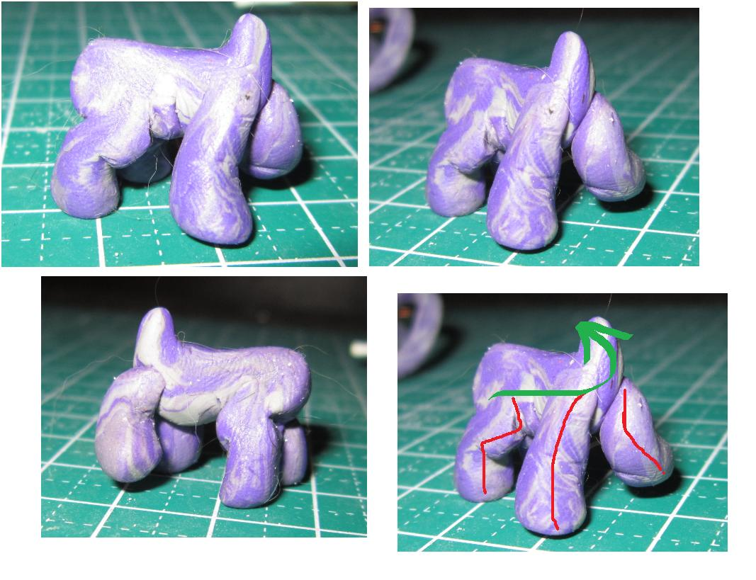 >>25430 Слишком плоско, смотри внимательно на >>25400 - ноги находятся в пространстве и объеме, задние - расставлены на "ширине плеч" и коленки с носками в разные стороны; передние - раздвинуты и на разной высоте - есть движение, на позу смахивать не надо - можно сделать твоего подавшимся вперед. Вот, можешь поглядеть сюда: http://aachi-chan.deviantart.com/gallery/49629200/MLP-Sculpts и основную галерею - http://aachi-chan.deviantart.com/gallery/ там виден процесс, особенно смотри на объем и движение.