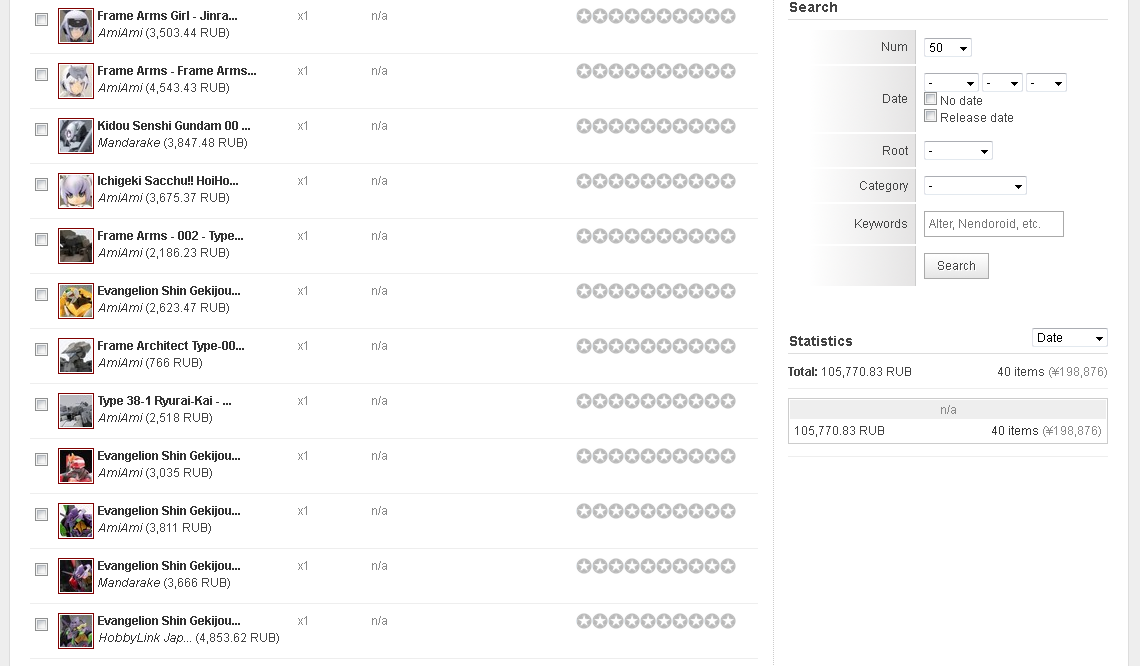 >>28436 >Там похотливые буряты обмалафьят фигурки, в жоппы позасунут Но на мандараке 85% фигур с неоткрытыми коробками. А на амиами выбирать то нечего особо кроме новья: ассортимент весьма скудный. Хотя, кое-что я приметил уже себе на амиами выгоднее манадарака. А так, стандартный мой прогон на наличие фигурки складывается следующим образом: 1)Мандарак 2)Пламоя 3)Солярис Жапан 4)Амиами 5)Ибей Собственно, так любая фигурка находится, вопрос только в цене. ВНЕЗАПНО, на Солярисе иногда цены попадаются ниже всех, да и стоимость они в инвоисе занижают без проблем (для билорусика как я это плюс).