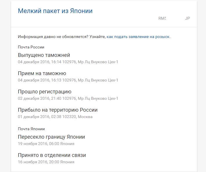 >>28007 > Как правило через 5 дней после того как посылка покинула Японию, она приезжает на склад в МСК, завтра будет 10 дней и нихуя. Это тебе очень везло раньше. Две-три недели может не трекаться спокойно, а еще скоро новый год и на почте начинается ад и погибель.