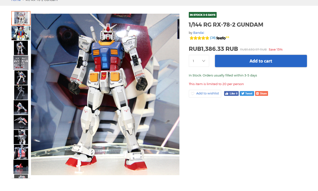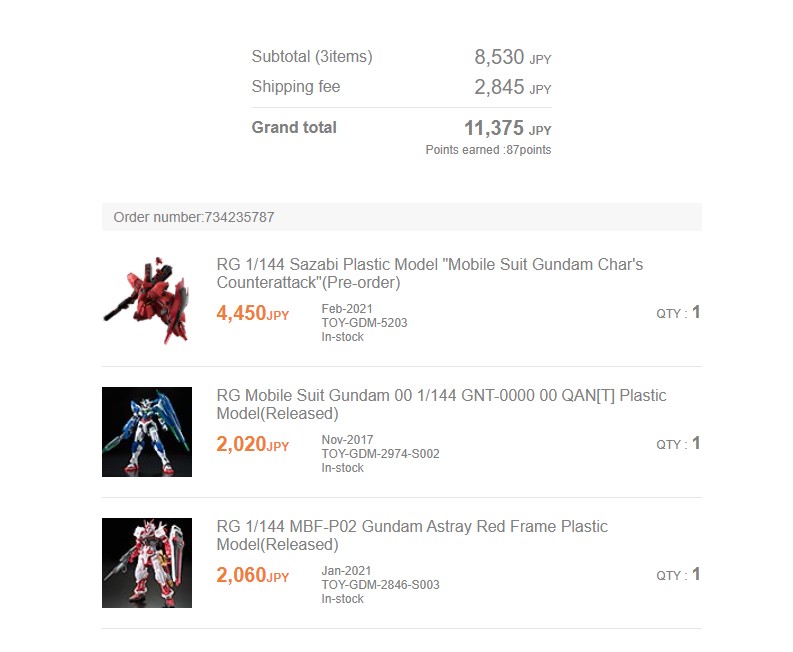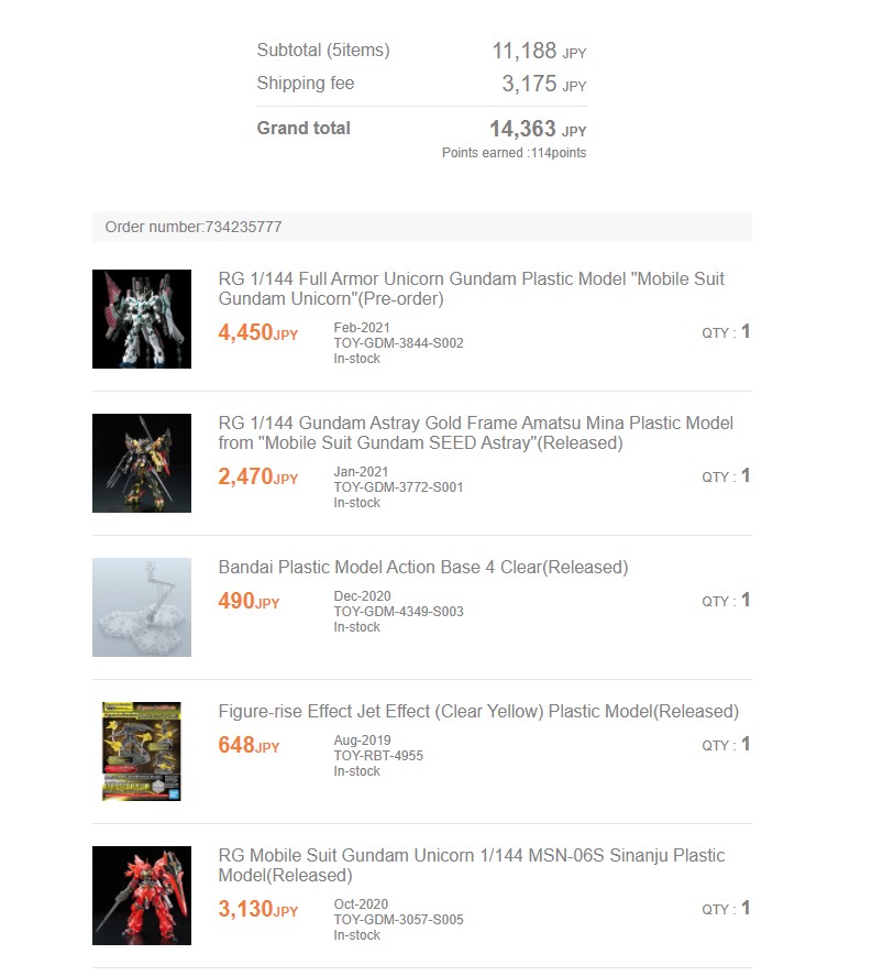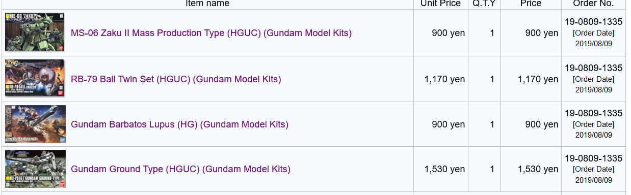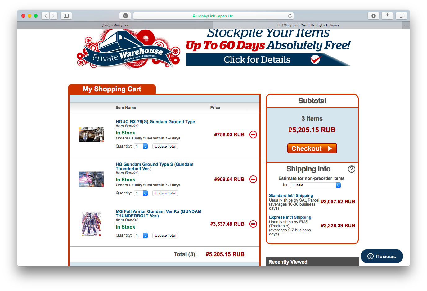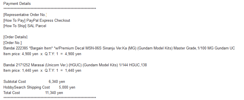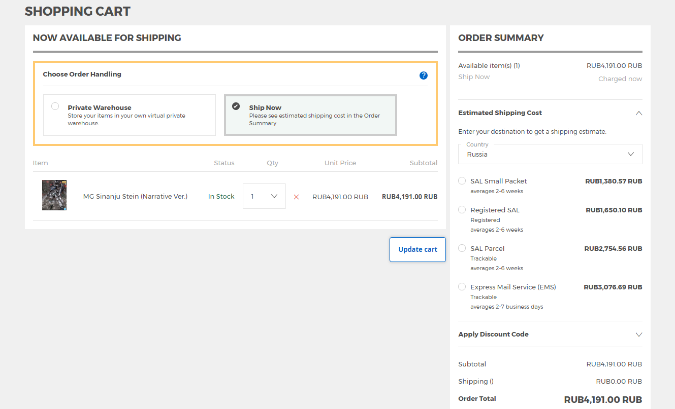 >>39278-кун на связи. Сделал второй заказ с 1999. В общем, методом перебора выяснил что за 990 йен можно заказать две стандартные HG-коробки и неограниченное количество мелких пакетиков типа декалей/фототравления/запчастей от котобукии/etc., но на сумму не больше 60 долларов. При превышении лимита по стоимости на одну коробку или по сумме стоимость становится 1440, потом 1940, потом 2400, и потом 5800. При этом при попытке заказать RG стоимость доставки сразу становится 2400. Вывод: наебать систему не получится, но заказать пару гандамов за тысячу рублей, которая превратится в 1300 в Москве вполне реально, что для меня норм.