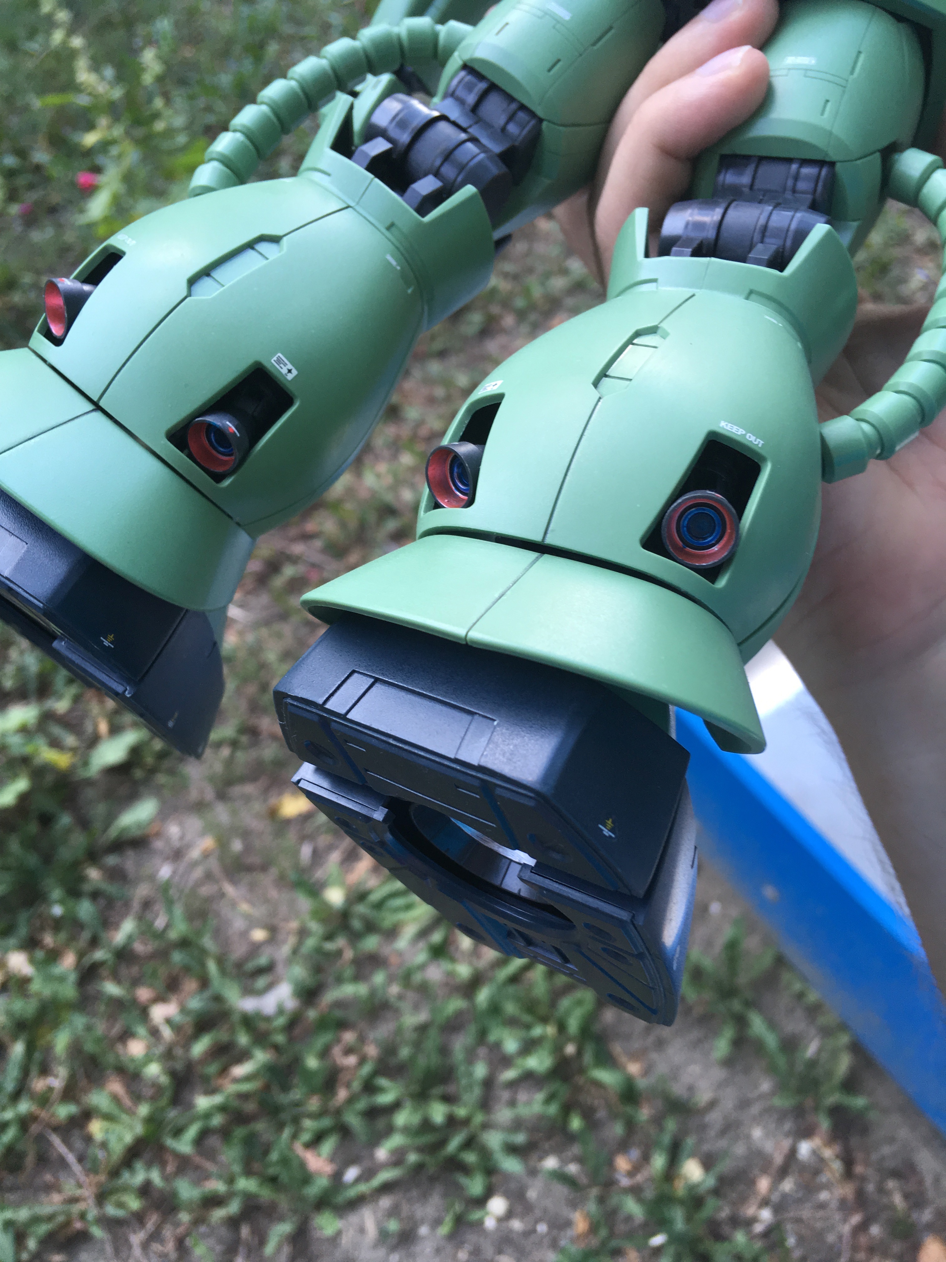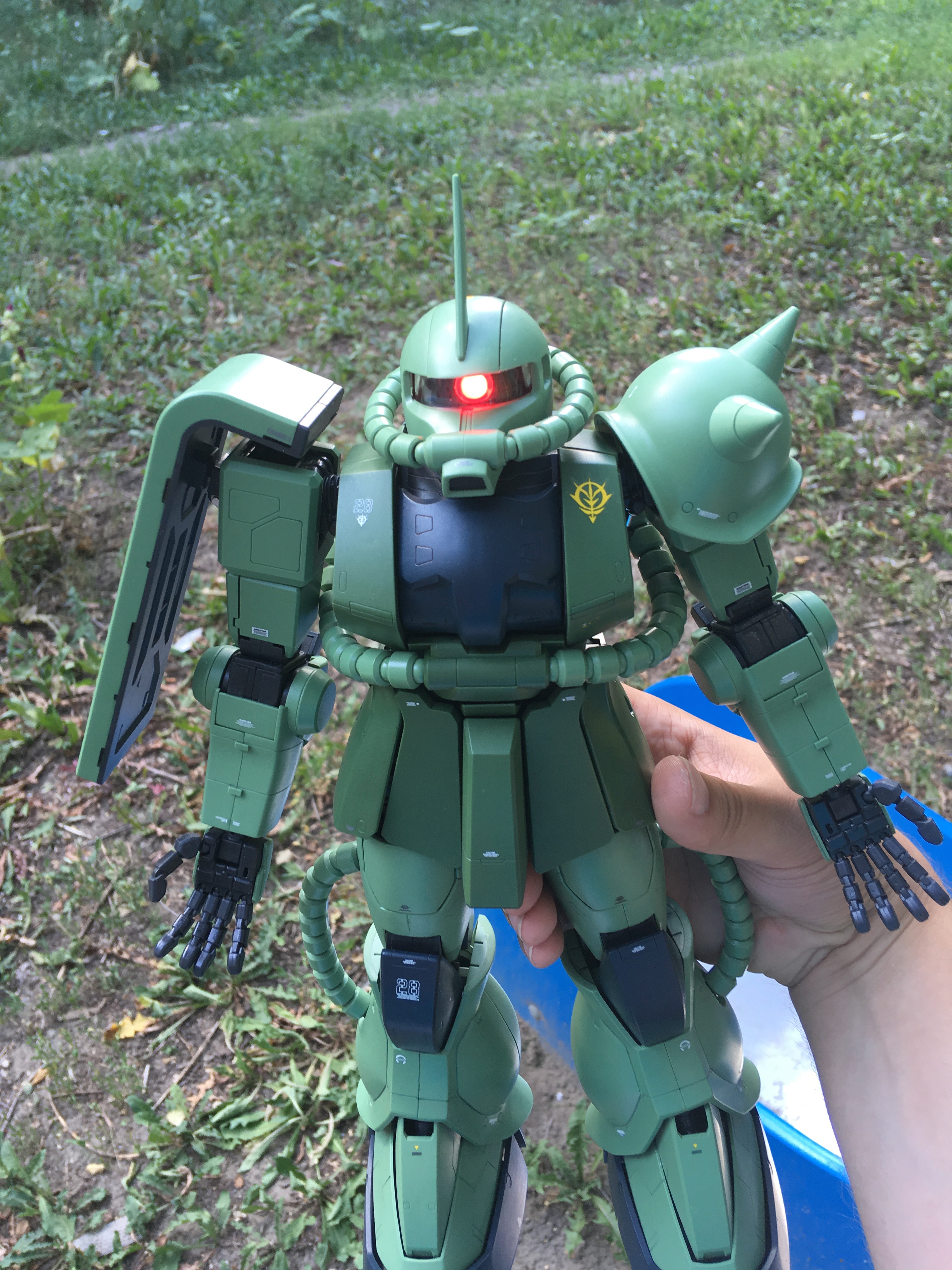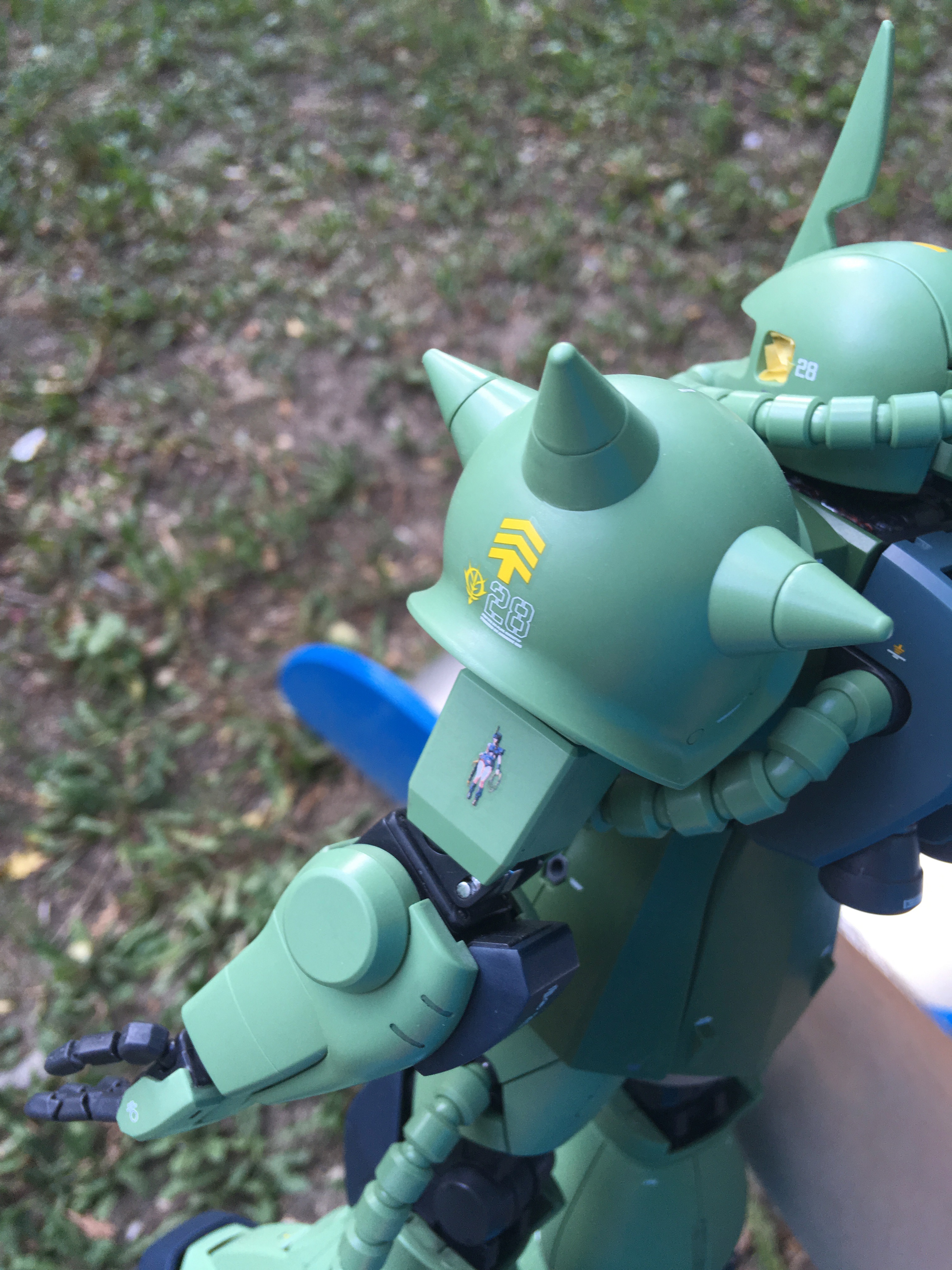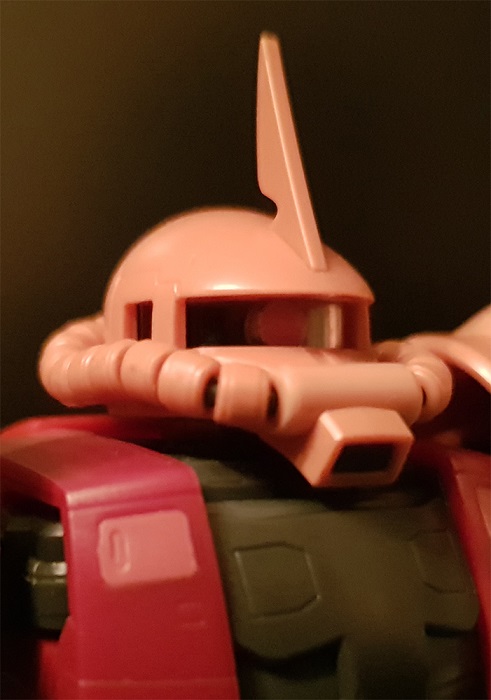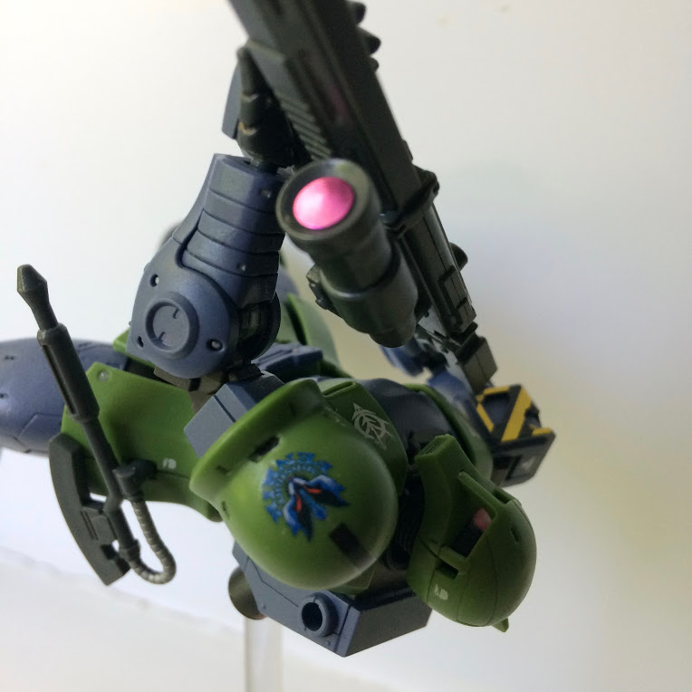 RG Заку просто отличный, собрался за один день. Очень понравилась идея с движением окуляра: двигаешь голову - "глаз" поворачивается в эту же сторону. В обзорах видел, что у других Заку нужно было снимать голову и сдвигать маленький рычажок снизу. Наклейка из комплекта не понравилась, так как она слегка больше детали и потому по краям загнулась, что портило вид. А самое весёлое то, что нашёл у себя в загашнике краску 1 в 1 совпадающую со цветом "глаза", что позволило сделать всё аккуратней.