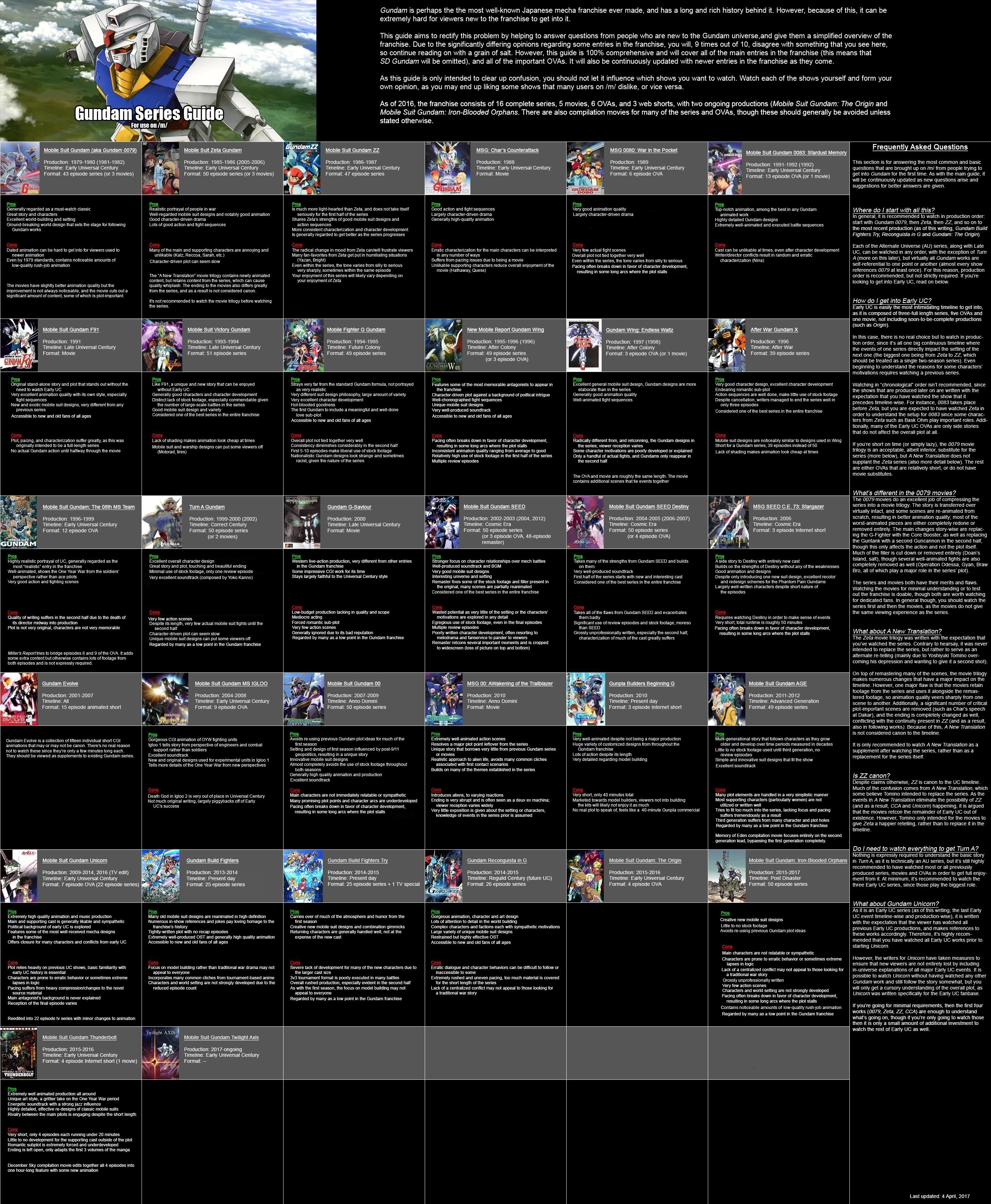 >>36702 > стоит ли начинать с hg, или можно сразу брать mg или rg? На gh меньше детализация и масштаб. Rg очень часто даже детализированнее чем mg. В принципе просто бери то что выглядит покрасивше, серьёзных различий нет кроме того что у MG внутренний каркас надо собирать. > Где можно почитать про лор, чтобы понимать сеттинг и сюжет, чтобы по лору тоже ориентироваться при выборе кита? Аниме смотри, мангу или просто вики читай. https://2ch.hk/a/res/5357025.html Пикча слегка старая, но там разберёшься.