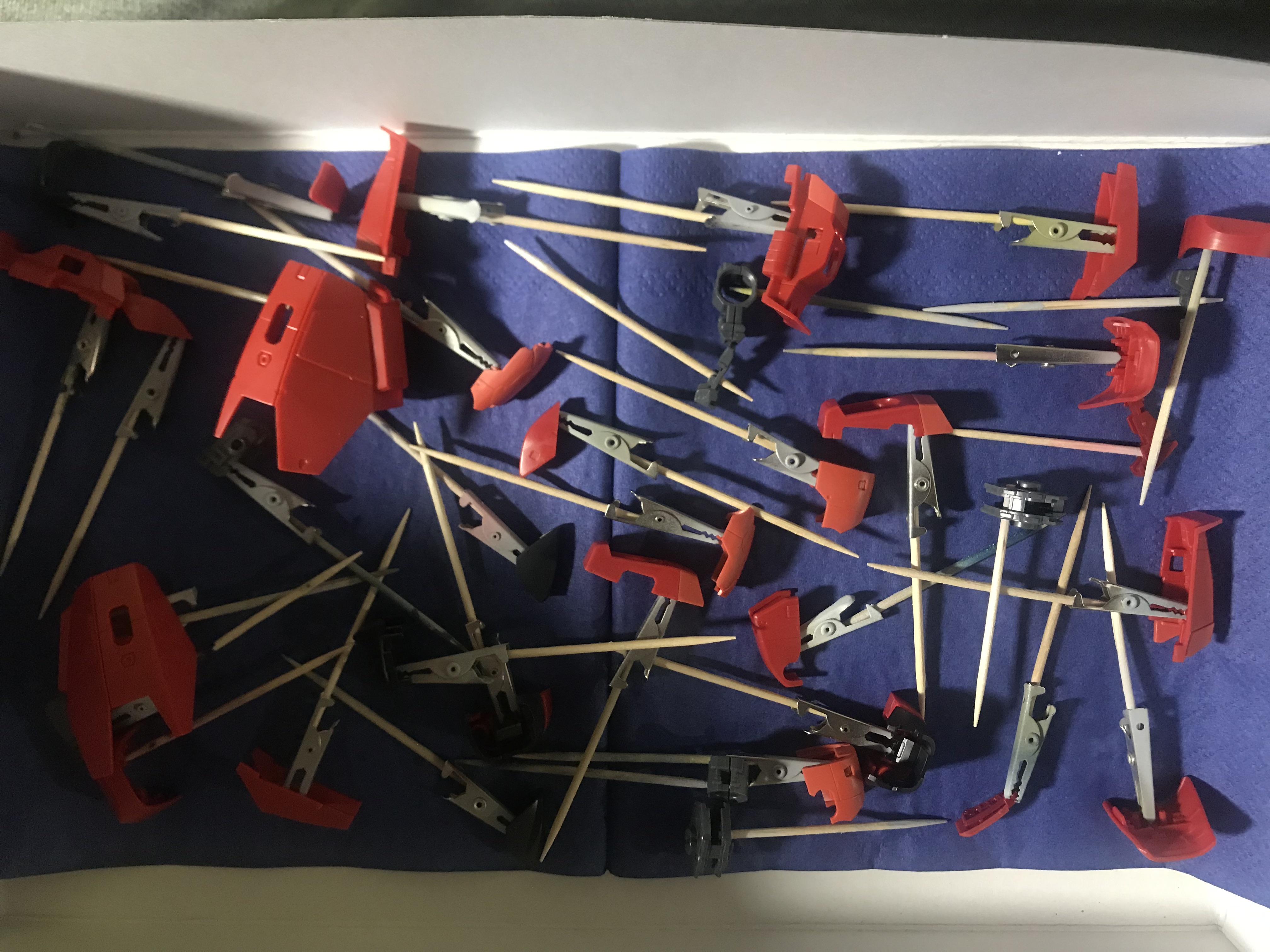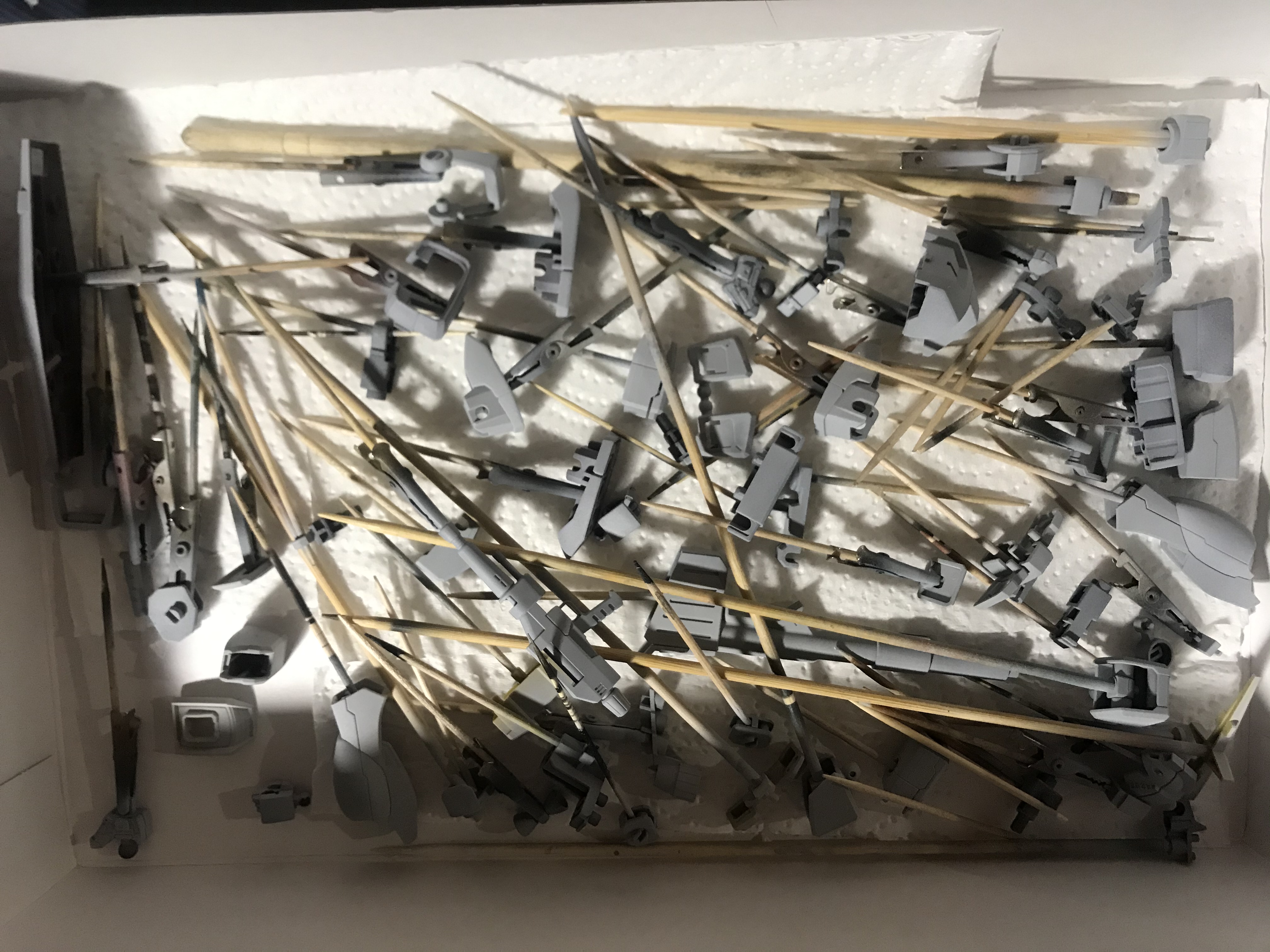 >>43728 Если HG, то лакировать можно прямо в сборе. Если MG/RG, то скелет и навесную броню можно лакировать отдельно. Отдельные кусочки брони можно держать на зубочистках, воткнутых в пенопластовую основу с одной стороны и в патафикс с внутренней стороны деталей с другой.