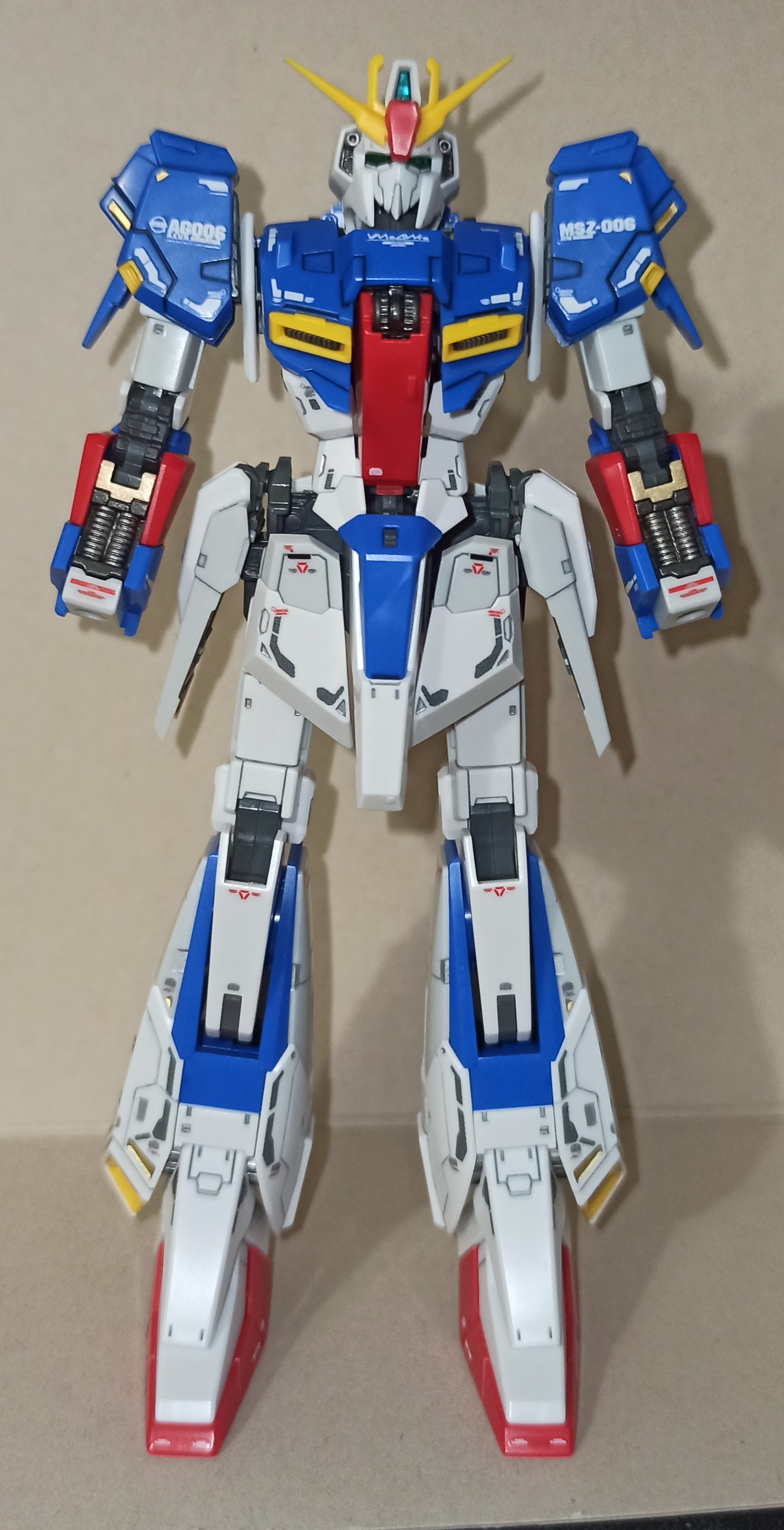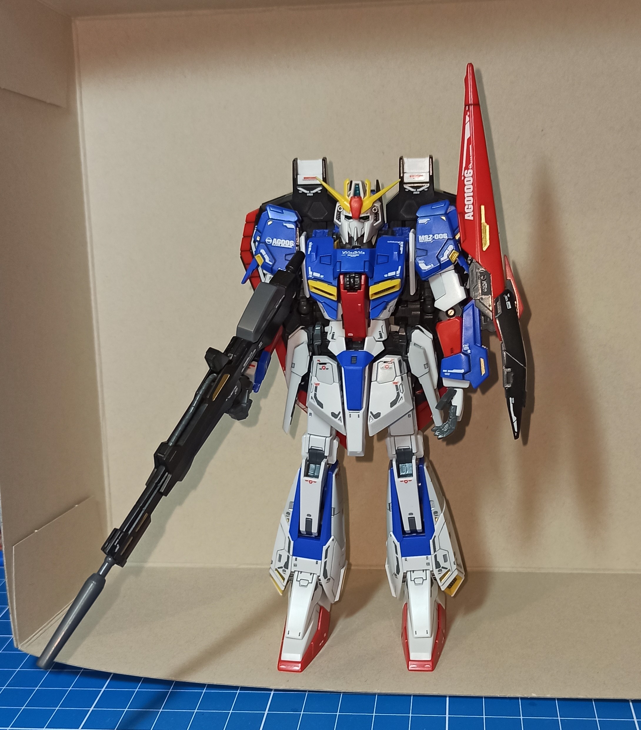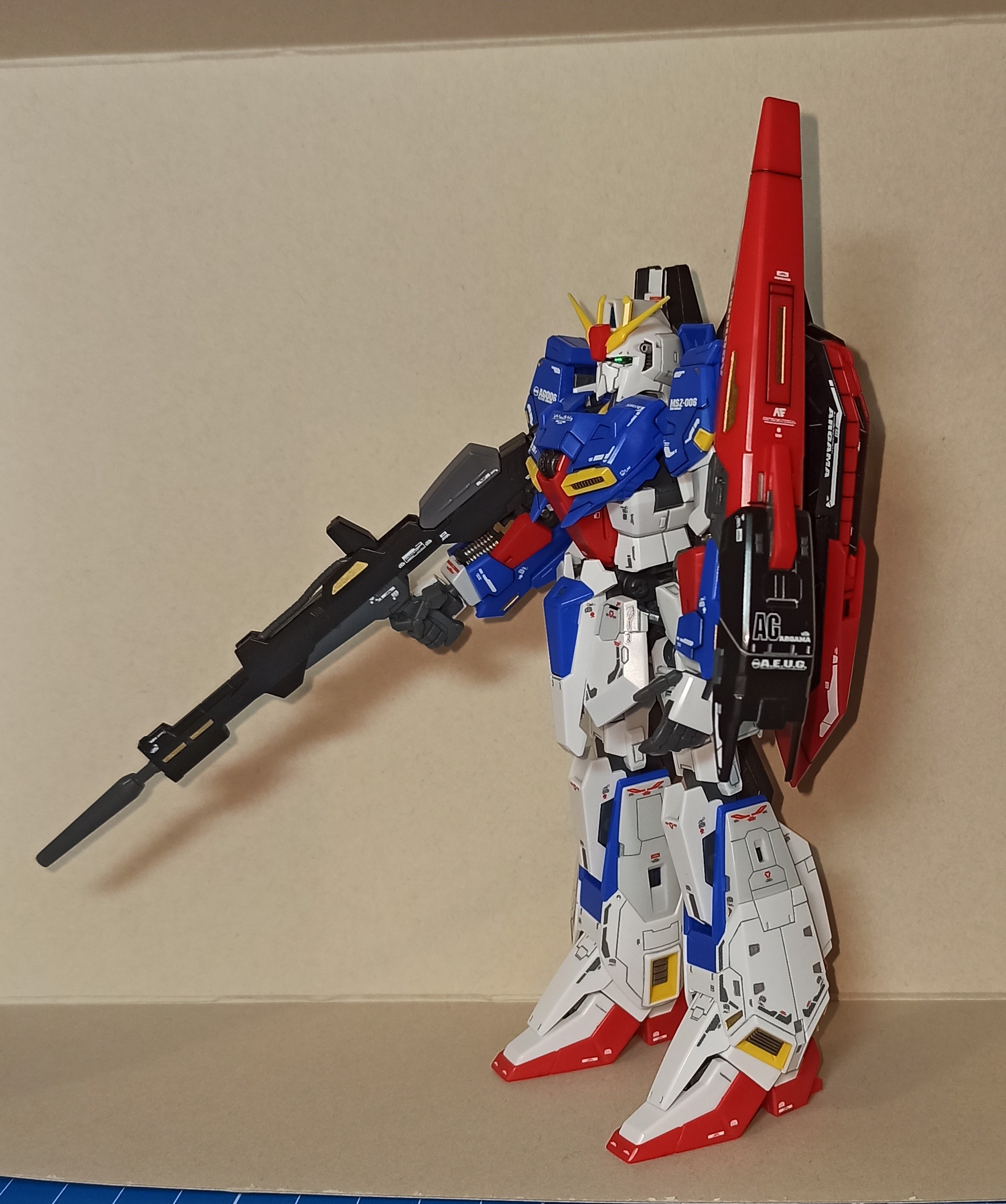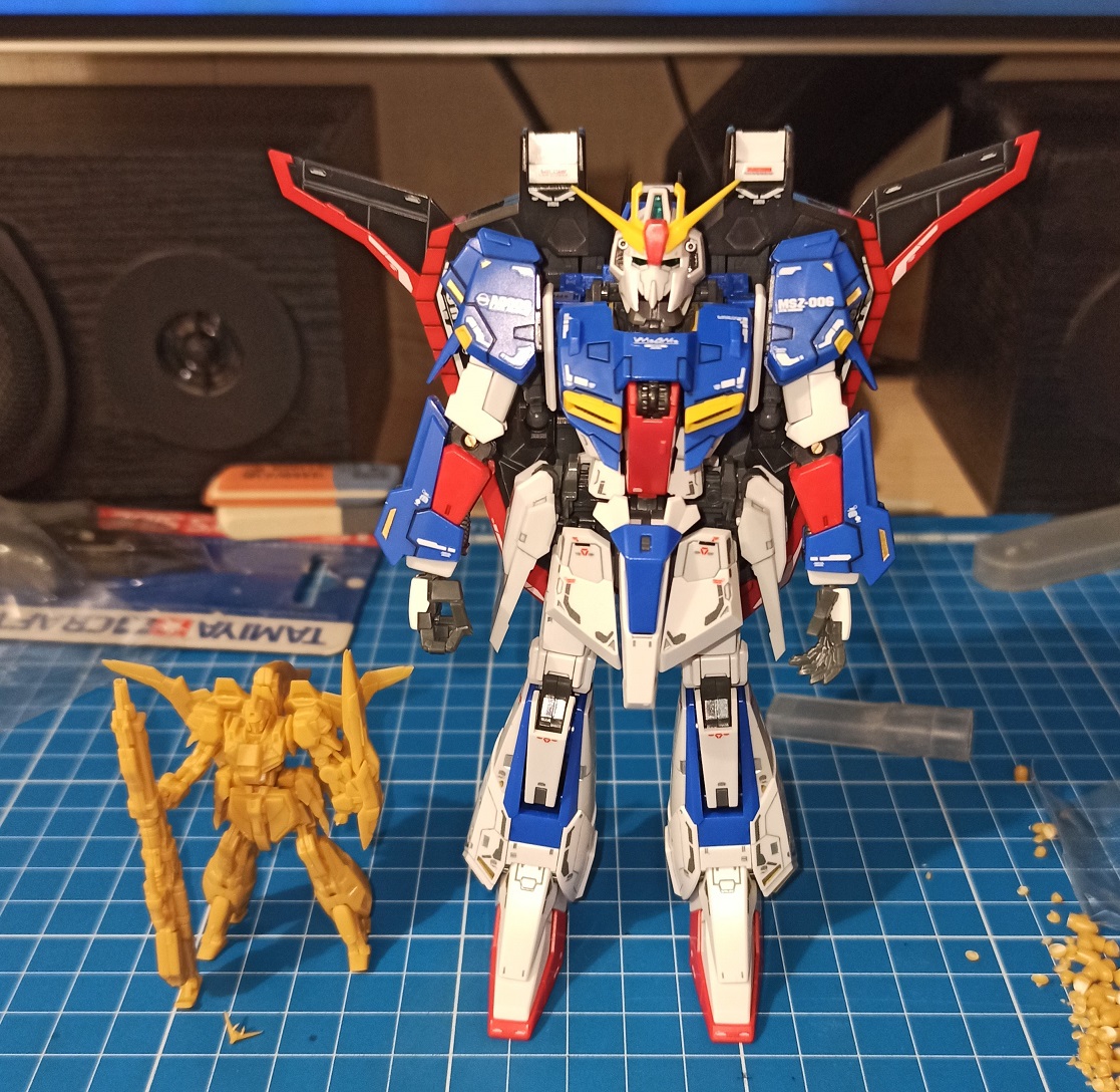>>56610 Для декалей на будущее могу посоветовать Tamiya Mark Fit Strong, либо Mr. Setter и Mr. Softener. Первое проще и дешевле. Жижу наносишь на поверхность, сверху декаль, выравниваешь, немного ждешь и выдавливаешь лишнее. Сверху ее же на декаль наносишь и пусть сохнет. Так лучше прилипают и немного меньше блестят. Хорошая модель, но будто что-то не то с грудной частью в этом исполнении. Вообще Зета несколько проклятый дизайн, у каждой вариации свои нюансы в реализации. У Дабл Зеты Ver. Ka годная есть.