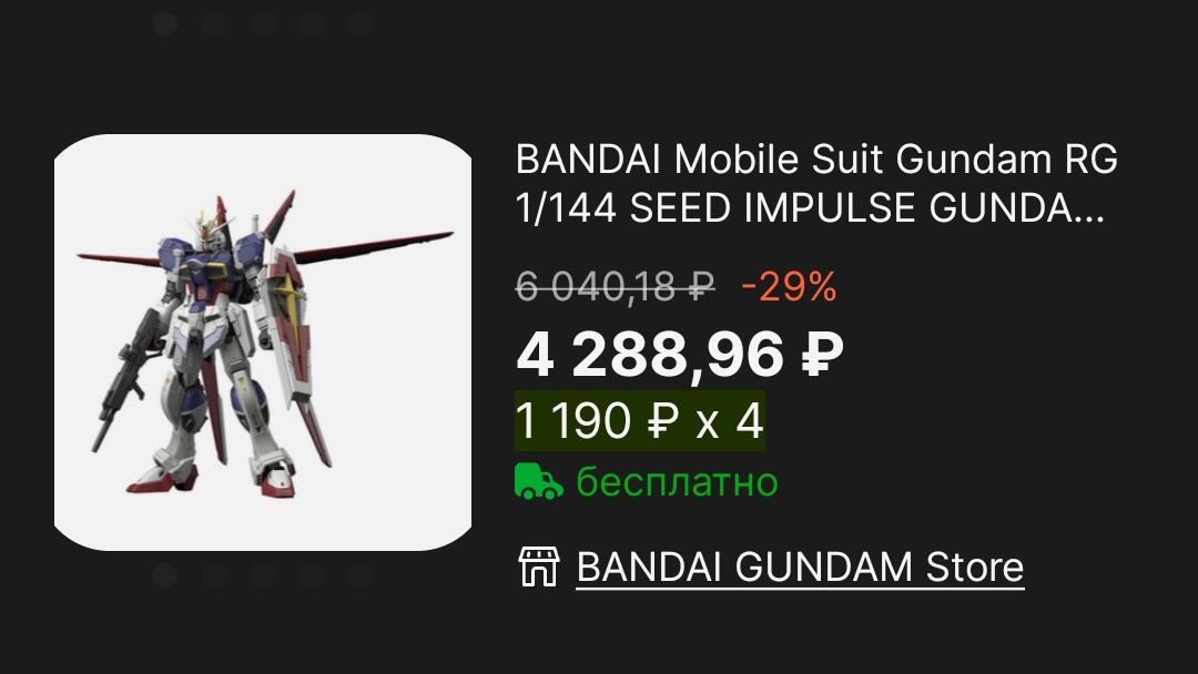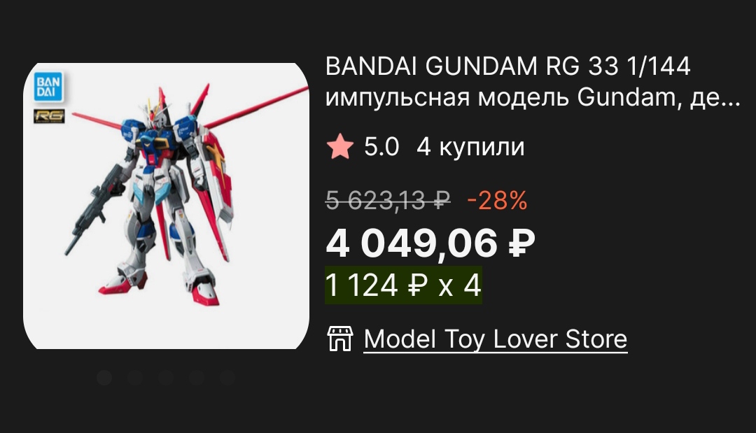 >>56342 Решил исходные цены посмотреть: MG 2011 года стоит 4800 йен, RG совсем новый 4200 йен. За счёт новизны и актуальности повысили ценник на рынке перекупов. RG после отхода от заранее отлитой основы стал дороже. >>56344 Почитал внимательнее и правда раньше просили продавцов заявленную стоимость посылки делать ниже. >>56346 Понимаю что вряд ли будет настолько плохо, но есть порыв затариться на всякий случай. Выжду недельку, может отпустит.