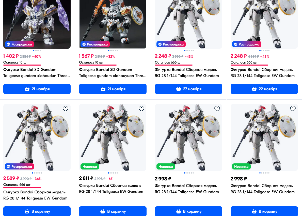 >>56272 Там то ли репринт случился дикий, то ли что. Высокие гуси за 3.3 к, единорог банши за 4 к, год гандам за 4 к, Форс импульс за 4 к, епиона можно за 4.8 взять. Пиздос, все что хотел взять все по каким-то скидкам сумасшедшим. А в ноябре небось и не будет нихуя скидок. А вот хай ню я вовремя взял. Ниже 7 к не вижу цен, а я брал за 5