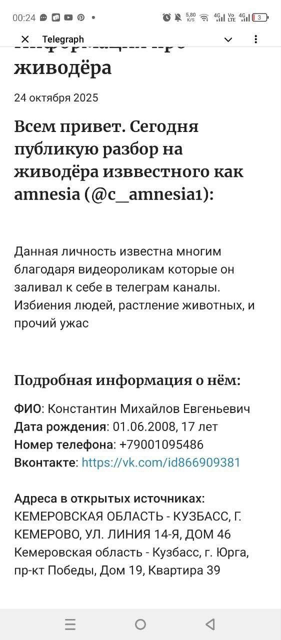 Ку, двач, просьба такая: подскажите че ваще по ситуации со всем уже известным живодёром (@c_amnesia1/byncat из последнего). Посты были тут и там, но чего-то конкретного нет/не нашёл. Кто-нибудь сейчас занимается ваще этим челом? Что-то про заявление и его личную инфу слышал, но без подробностей никаких к сожалению.