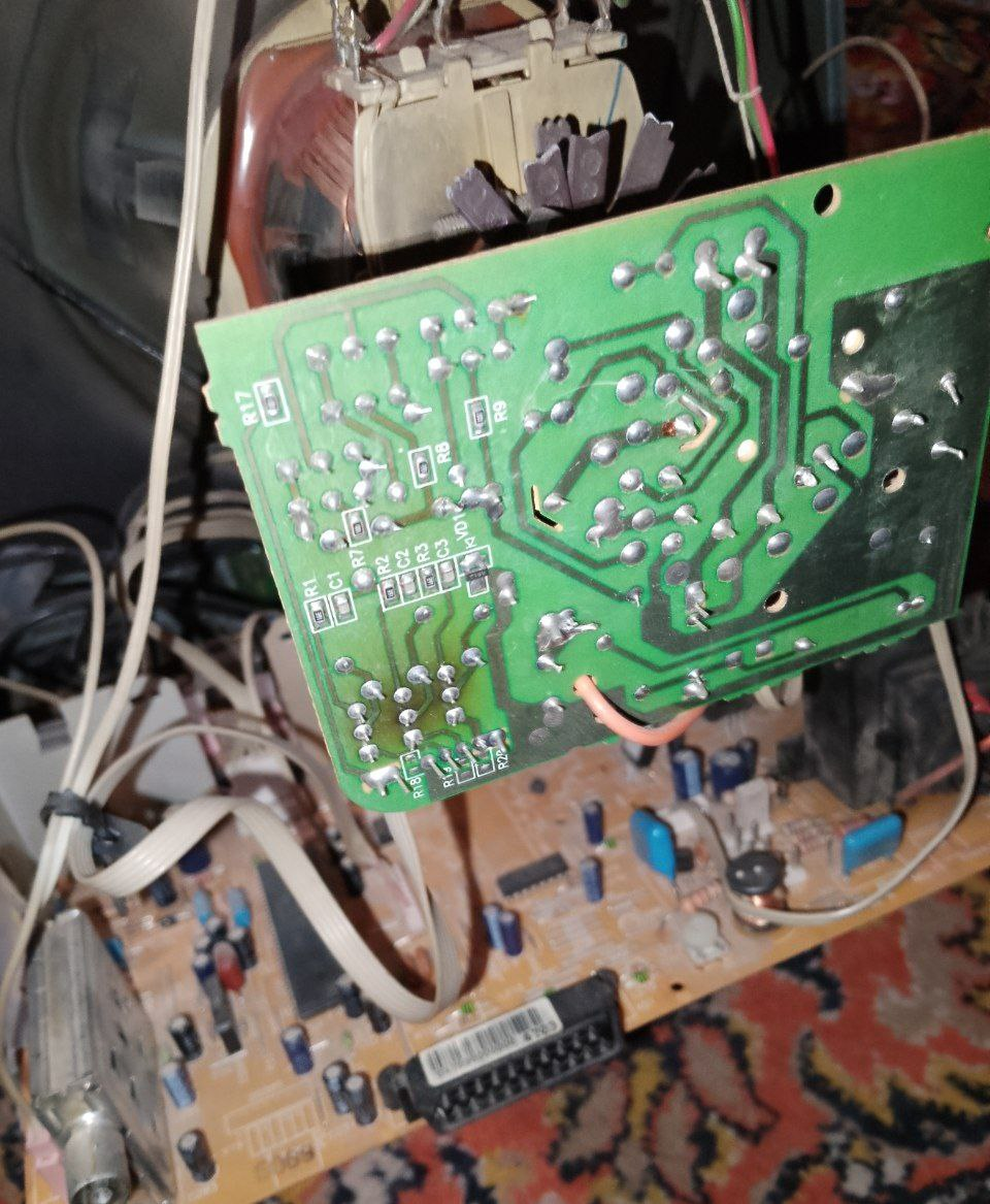 Всем доброго времени суток. Решил я починить старый ЭЛТ телевизор. Суть была в том что он просто перестал включаться(никаких признаков жизни, индикатор не горит, звука включения нет). Не чистили ТВ, судя по всему, еще со времен Ельцина. Я его начал чистить и заметил что плата кинескопа трохи подгорела. В общем на фото видно что транзисторам, как будто не хорошо. Как воскресить этого товарища, скажите пожалуйста