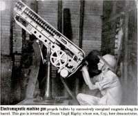 Архивы: Вергилий Ригсби Видео стиль игры электромагнитное пистолет (с 1934 г.)21 апреля 2013 в eksithТаким образом, вы думаете, что ваш видео игра имеет рельсотрон (или, возможно, Пушка Гаусса) из Doom, Quake, Mass Effect или что там у вас, что будет победить любую броню и непонятно прохладно. Увы, это сделано из пикселей.Ну, Вергилий Ригсби из Сан-Августин Техас запатентовал в 1934 году, что он назвал "электрический пистолет" - меткое описание.Через modernmechanix.comЧерез modernmechanix.comГ-н Ригсби рядом с макетом его "электрический пулемета" (Via davidszondy.com). Как задира ищет это?Г-н Ригсби рядом с макетом его "электрический пистолет" (через davidszondy.com).Как задира ищет это? Пробковом шлеме он носит делает его еще лучше.Установленный на палубе корабля или на кузове грузовика (если он был подачи ядерных энергетических), это было бы грозным оружием.Установленный на палубе корабля или на кузове грузовика (если он был подачи ядерных энергетических), это было бы грозным оружием.Болты. Я люблю болты.Помещение за это, что это, по существу Пушка Гаусса с относительно быстрым временем перезарядки (даже в те дни, EM пушки потребовалось время, чтобы "перезарядить") и вместо того, чтобы полагаться на комплексном запуска схемы, которые бы непрактично в то время, прежде чем кремний чип, он пошел с пусковым колесом.Coilguns часто путают с рейлганы, однако принципы работы очень разные. Хотя они оба работают на электромагнетизма и требуют огромного количества энергии, в рельсотроном, нет катушки на-SE. Снаряд / арматура и два рельса по обе стороны создать один гигантский электромагнит. В то время как в Пушка Гаусса, каждая катушка электромагнита мгновение напряжением последовательно, как снаряд получает около каждого из них.Это требует coilguns быть более сложной, с несколькими стадиях ускорения, которые требуют сложных механизмы запуска и тщательное времени. Таким образом, coilguns более удивительным.Это схематично показано, как каждая катушка выполнена с возможностью напряжением в последовательности, как руку в запуске колесо вращается. Обратите внимание, как каждая катушка становится меньше по ширине.Это схематично показано, как каждая катушка выполнена с возможностью напряжением в последовательности, как руку в запуске колесо вращается. Обратите внимание, как каждая катушка становится меньше по ширине.Как снаряд получает около очередном витке в последовательности, который находится под напряжением. Как снаряд входит в катушку, это обесточен и на следующий катушка активирована, потянув ее через ствол таким образом, пока он не выйдет из пистолета с огромной скоростью. Поскольку время снаряд проводит в каждой катушке короче, как он ускоряет, г-н Ригсби благоразумно решили уменьшить ширину каждой последующей катушкой в стволе.Деталь запускающего колеса показывает, как площадь поверхности каждой контактной пластине в последовательности становится меньше, а количество времени, снаряд находится в каждом катушки становится короче. Это низкая техническая времени в дни перед передовой запуска схемы.Деталь запускающего колеса показывает, как площадь поверхности каждой контактной пластине в последовательности становится меньше, а количество времени, снаряд находится в каждом катушки становится короче. Это высокие технологии времени в дни перед передовой запуска схемы.В эти дни, coilguns использовать ба