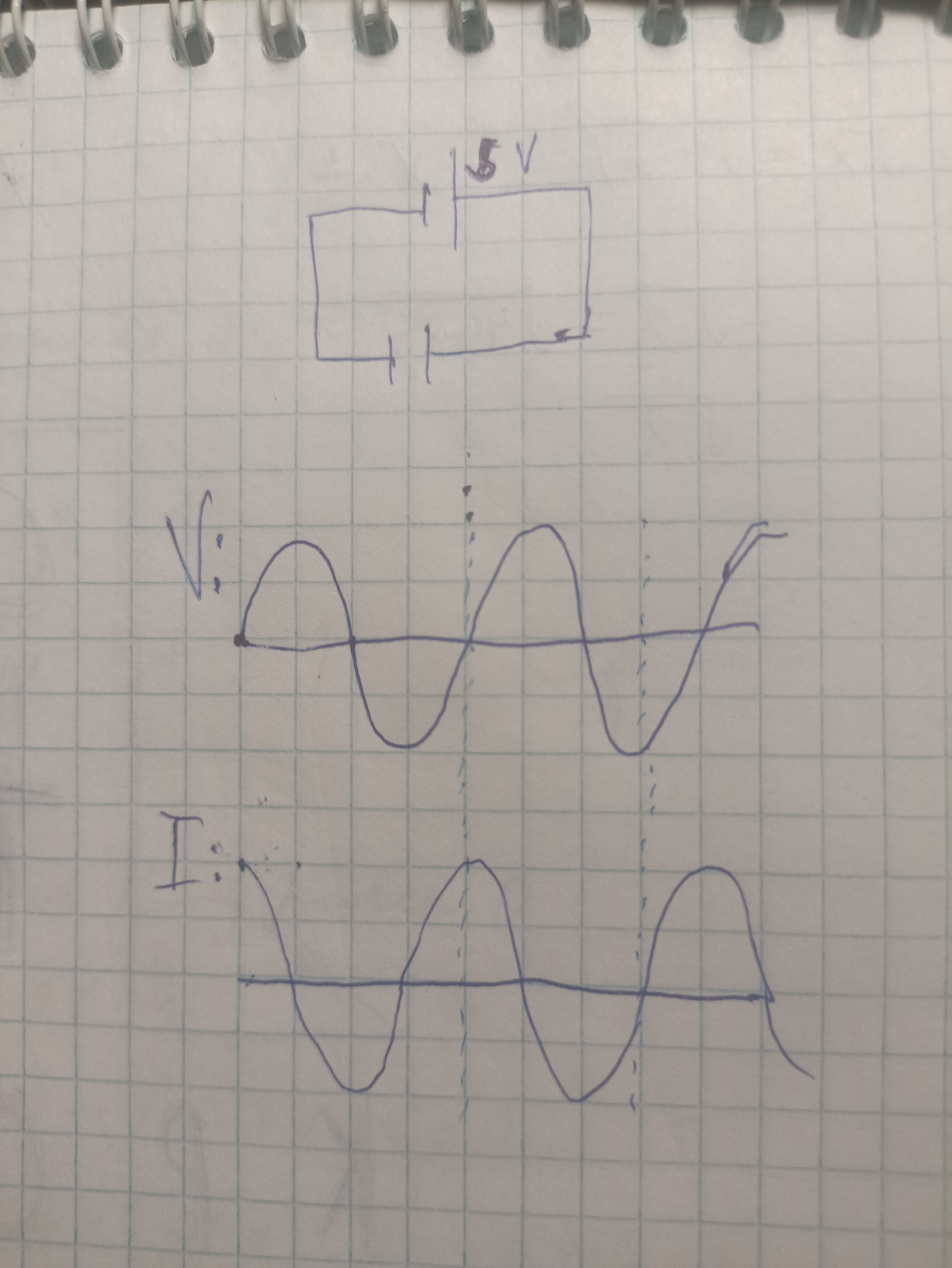 короче я уже очень долго думаю над этим вопросом и никак не могу понять. пришел к выводу что сила тока зависит не от напряжения, а от производной напряжения. хоть и это звучит довольно странно. вижу я это вот так: на пике напряжения конденсатор заряжен максимально и емкостное сопротивление велико. значит на пике напряжения ток отсутствует. когда напряжение равно 0, ток течет максимально, так как емкостного сопротивления нет. но понять я не могу одной вещи. если напряжение равно 0, то есть ЭДС нету, то как ток может течь? при ЭДС равном 0 нет никакой силы которая бы заставила электроны толкать следующие