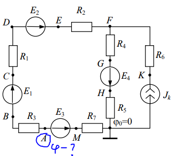 Товарищи, а как посчитать потенциалы там где просто источник ЭДС а не резистор? В точке M потенцевал нашел, а как в точке A - хз ваще; даже не знаю что именно гуглить чтобы получить необходимые знания для решения задачи.