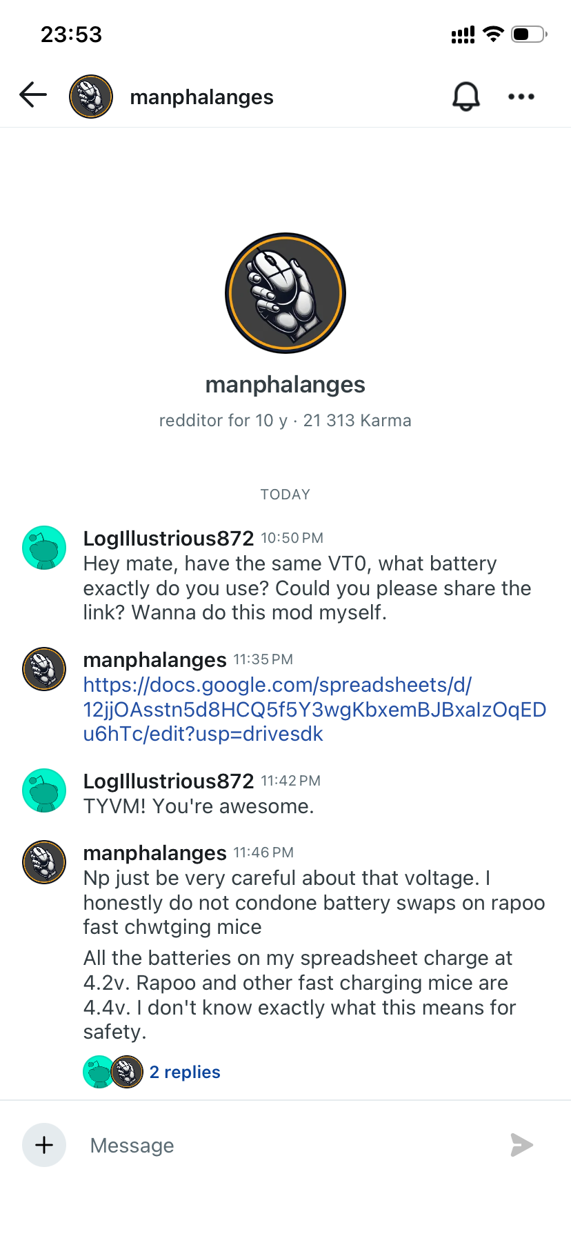 >>586332 В контексте современных компьютерных мышей существует дроч на минимально возможный вес девайса. Есть такая тема как замена фабричного, более ёмкого, но тяжёлого аккумулятора на сторонний, менее ёмкий и намного более лёгкий по весу. Существует, допустим, такая мышь как Rapoo VT0, 49гр, 800 махов аккумулятор. На реддите есть чел, который все эти мыши разбирает и придумывает, как бы их облегчить. И вот в случае упомянутой мыши он заменил дефолтный аккум на 150-маховый (могу пиздеть), и мышь сразу полегчала на 10 грамм. Вот тред с маркировками и всем нужным: https://www.reddit.com/r/MouseReview/comments/1oxanao/rapoo_vt0_disassembly/ Мы там решили обмазаться этим модом и заказать с али такую же батарейку, но сначала написали челиксу в лс. Ответы на оп-пиках. Плюс он приложил свою таблицу: https://docs.google.com/spreadsheets/d/12jjOAsstn5d8HCQ5f5Y3wgKbxemBJBxaIzOqEDu6hTc/htmlview Там пока нет VT0, но есть куча другой полезной информации. Как быть? Реально ли можно ёбнуть мышь чуть-чуть неверным вольтажем? Там отличие всего в 0.2V. Интересно мнение шарящих мужчин, то есть вас.