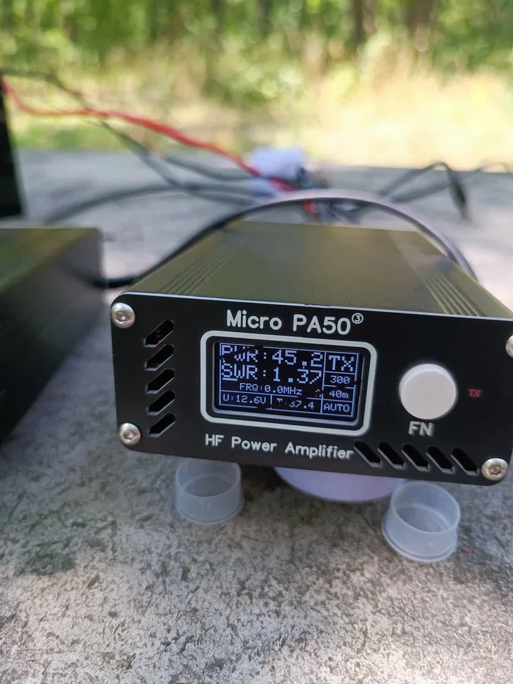 Это успех. 30 метров стального троса из окна. запитывается через параллельный колебательный контур, противовес заземление в розетке. Усилитель оконечный на irf510, драйвер на кт315. Блок питания показывает что он потребляет 6 ватт. На выходе неизвестно, сколько