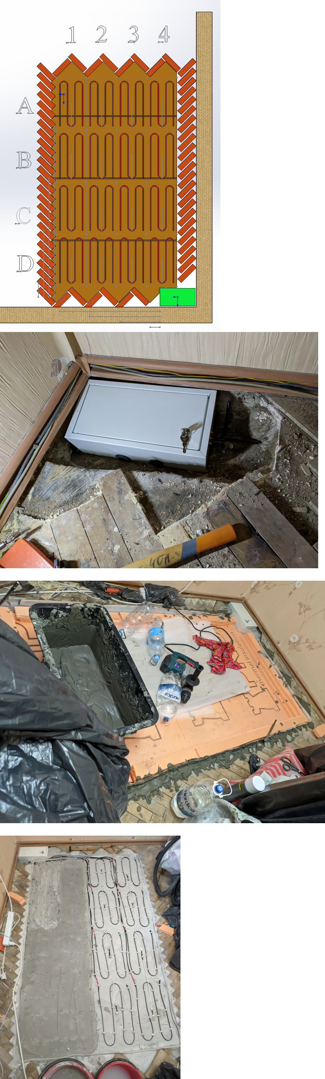 Rate me! Зимой мёрзнут ноги, решил сделать тёплый пол в месте комнаты, где сижу. Разбил на 16 зон чтоб включать только зону под ногами. Купил самый дешевый self regulated кабель на али, нарезал на куски, распаял, добавил в центр каждой зоны по термистору. Раскопал яму посреди комнаты, уложил пенополистирол, залил смесью для тёплых полов, в середине кабели. В угол комнаты залил металлическую коробку для автоматов, туда поставил плату на ESP32 с SSR для управления нагревателями и токовый трансформатор для замера тока, антенна выведена наружу. Управление через браузер и MQTT по вайфаю. Сделал лимит 40 градусов, прогревал одну зону до 40, всё работает. Ощущается как тёплая каменная печь. 10 из 10, зависимость лютая.