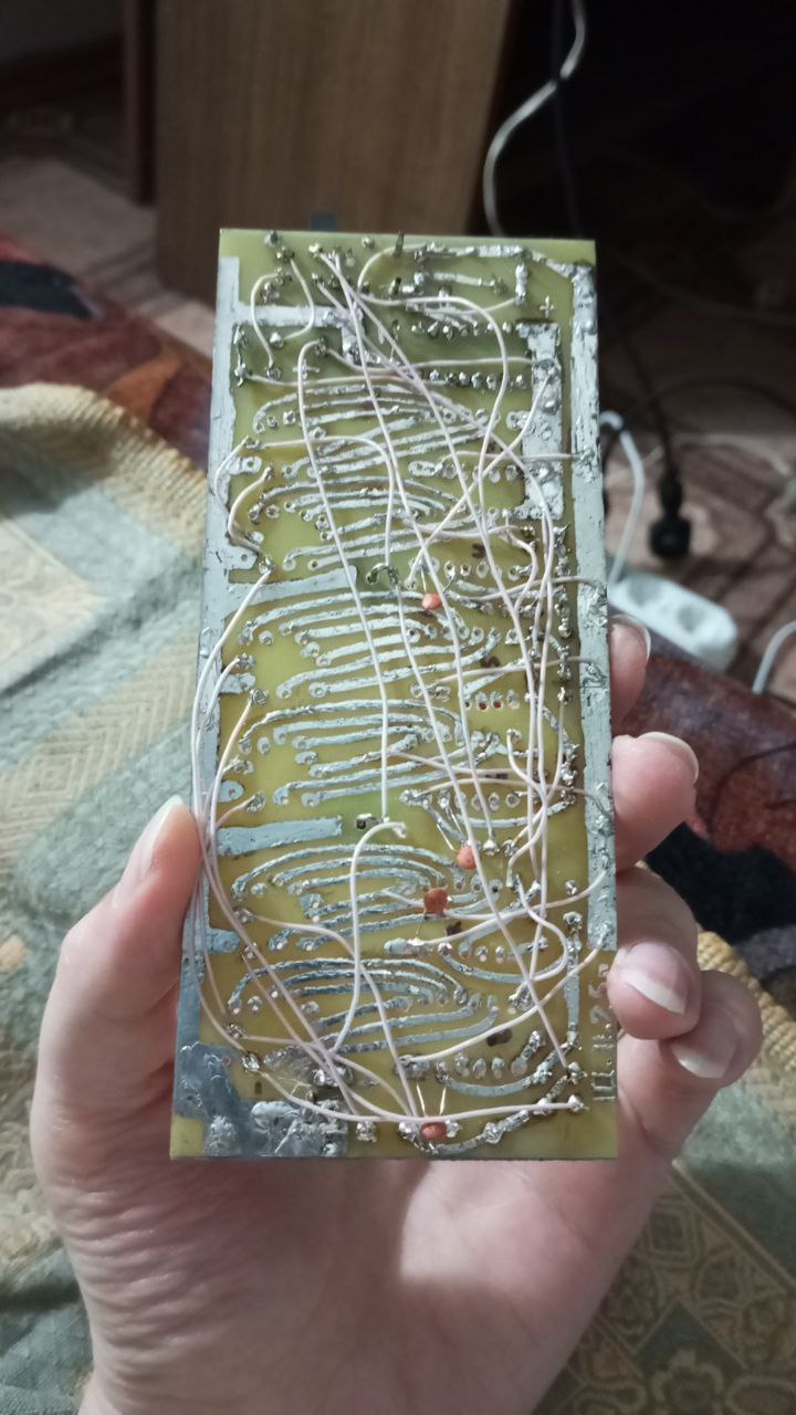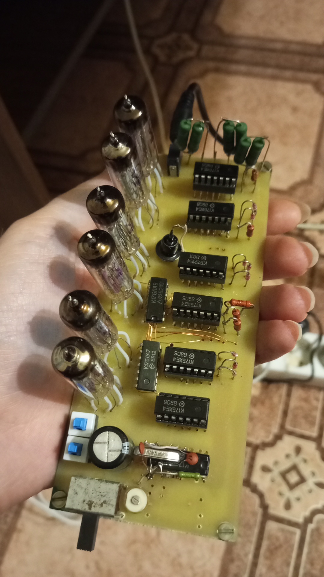 >>568856 (OP) Решила вспомнить юность. Собственно, часы на вакуумных индикаторах. Схема из постсовкового самиздата. Что зацепило, так это то, что там все на одном типе мелкосхем собрано. Допилила напильником дженератор тактовый типовой схемы, логику переключения на И-НЕ ну и антидребезг с электронной коммутацией для кнопок настройки часов. В остальном все по канону - плата самопальная, методом рисования from scratch маркером от руки, травление хлорным и свирление дырбочек. Печатно-лапшичный монтаж из МГТФ. Часы флрмата RAW. Лепота, ёпта