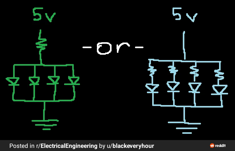 Загадку вас принес. Какой вариант схемы предпочтительнее и почему? Левая схема с общим резистором на все 4 светодиода или правая схема с резисторами на каждый светодиод?