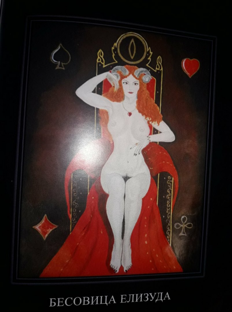 «О Велика Елизуда Бесовица похотна мати ты Бесов многих скорородяща ты да на похоть лиха ко тобе с верою молю да свечу возношу тобе с высоты своеи призри на мени да пособи во деле снизоиди похотию свеи на рабицу имярек со слезным прошением ко тобе взываю даруи мне тело и ум рабицы имярек а я веси веки сви ко тобе молити стану нещадя живота свого. Нима!».