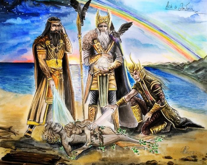 Встретили асы на земле, не имеющей судьбы, Аска и Эмблу, ни силы не имевших, ни доли. Души не было у них, разума не было, ни крови движения, ни цвета прекрасного. Душу дал Одинн, разум дал Хёнир, кровь дал Лодур и цвет прекрасный.»