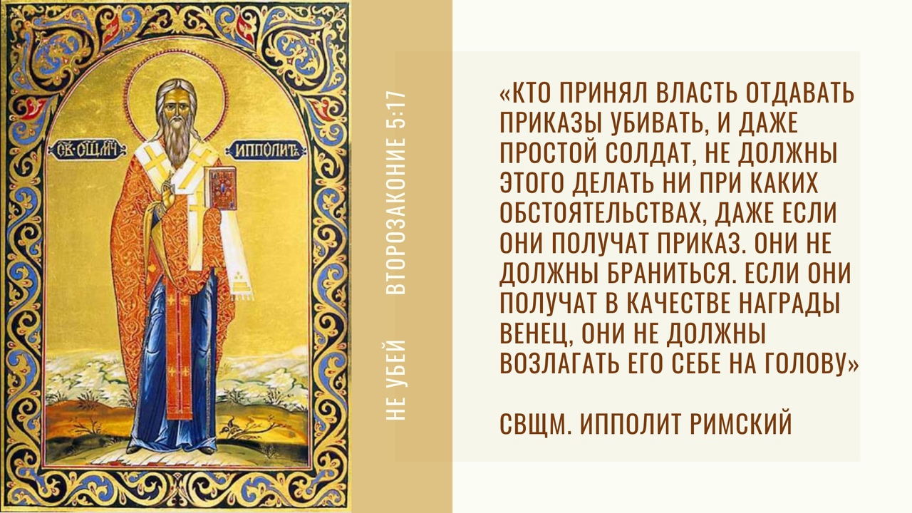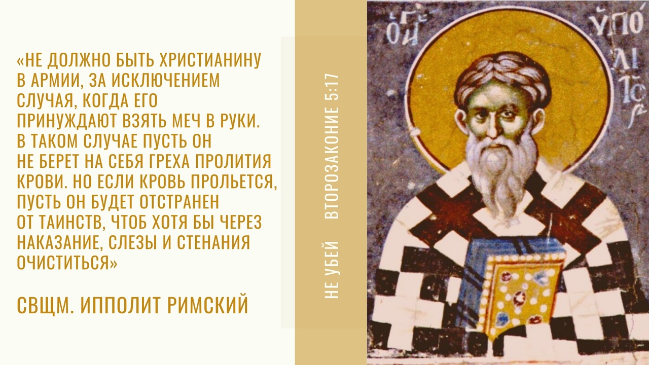 «Кто принял власть отдавать приказы убивать, и даже простой солдат, не должны этого делать ни при каких обстоятельствах, даже если они получат приказ. Они не должны браниться. Если они получат в качестве награды венец, они не должны возлагать его себе на голову» (Ипполит Римский (ок. 170 — ок. 235). Каноны Ипполита, канон 13). «Не должно быть христианину в армии, за исключением случая, когда его принуждают взять меч в руки. В таком случае пусть он не берёт на себя греха пролития крови. Но если кровь прольётся, пусть он будет отстранён от таинств, чтоб хотя бы через наказание, слёзы и стенания очиститься» (там же, канон 14). «Оглашаемый или христианин, желающие стать воинами, да будут отвержены, потому что они презрели Бога» (Ипполит Римский. Апостольское предание, гл. 16.9).