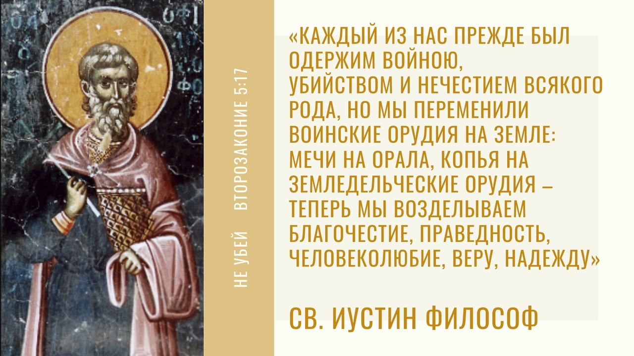 «Мы, которые исполнены войной, взаимным кровопролитием и всяким злом, изменили своё воинское оружие, наши мечи на орала, а наши копья на орудия по обработке почвы» (Иустин Мученик (ок. 153). Диалог с Трифоном, пар. 110).