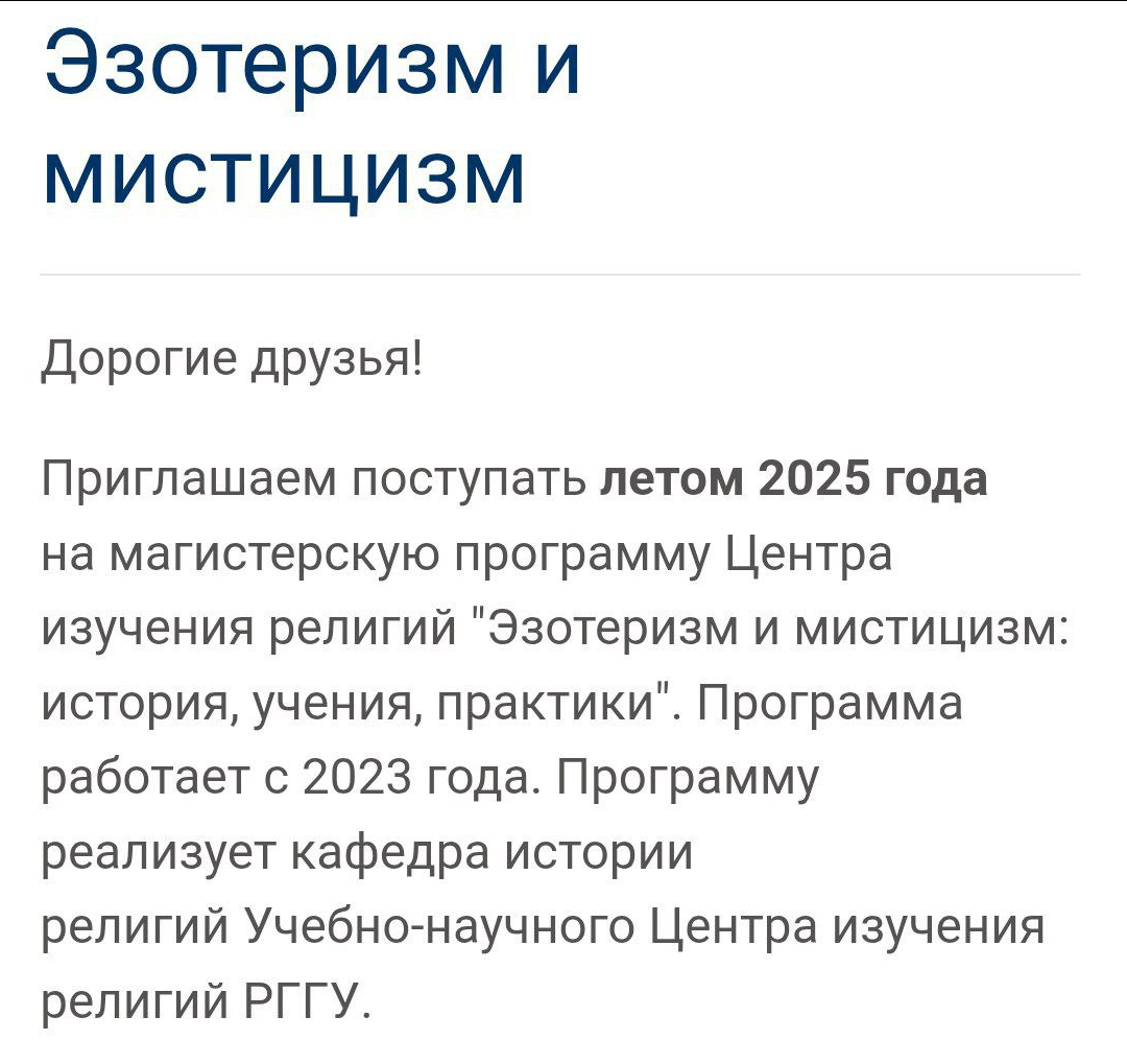 А в РГГУ обычное религиоведение, можно сказать "сектоведение", потому что не про традиционные религии. В рамках этой программы Оксана Куропаткина преподает курс по истории христианского эзотеризма. Все остальное вполне вписывается в сектоведение в духе Иринея Лионского. Чтобы спасать увлеченных эзотерикой россиян, нужно понимать, что это такое. Православные должны в таких темах разбираться, чтобы потом показывать истинность православия каким-нибудь тарологам и рунологам.