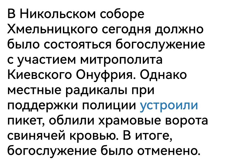 >>1124390 Захват собора в Черкассах его "прихожанами" из ПЦУ (по мнению некоторых СМИ). Правда, на Пасху эти прихожане (и какие-либо другие) не пришли. Кураев кстати про это писал