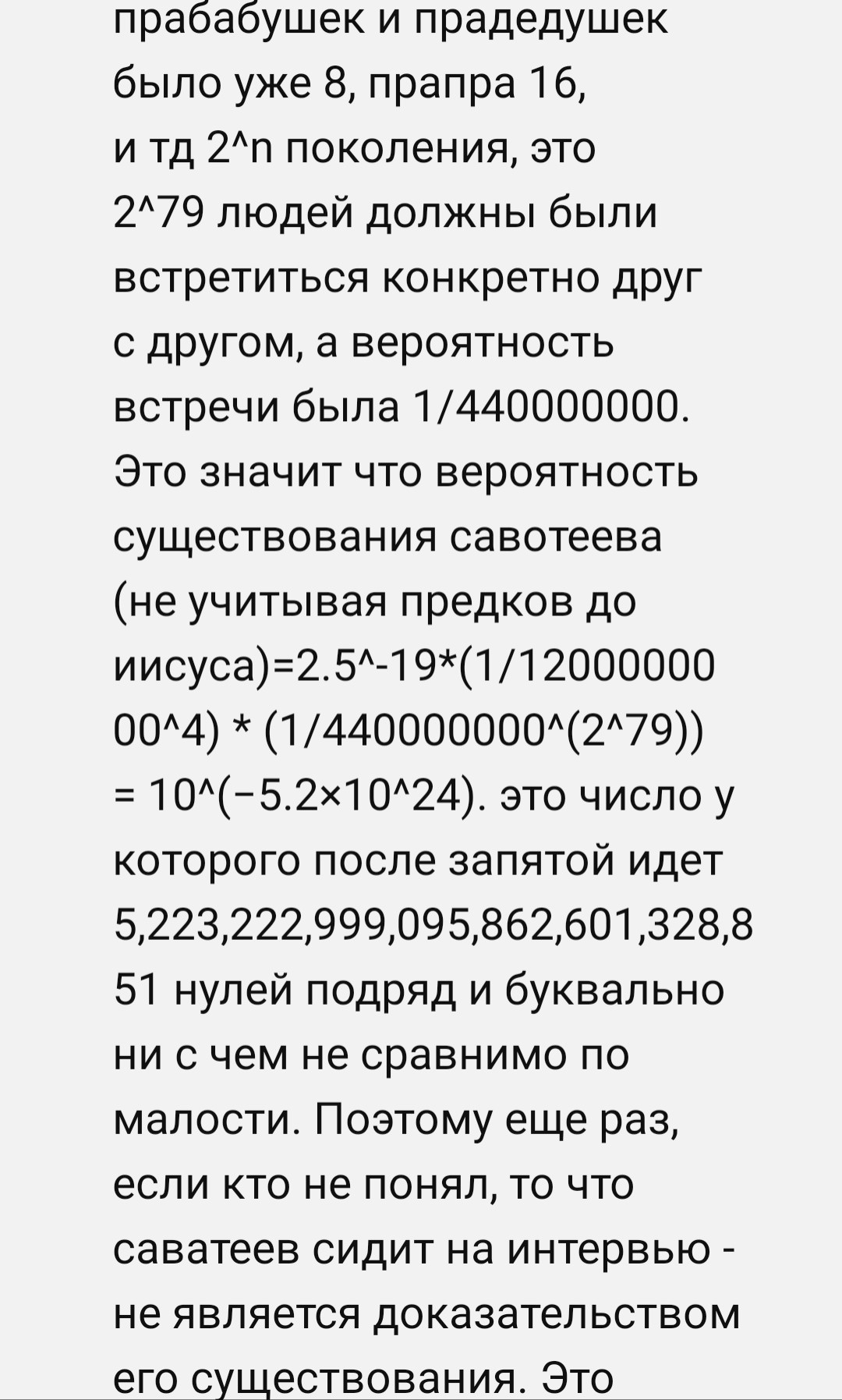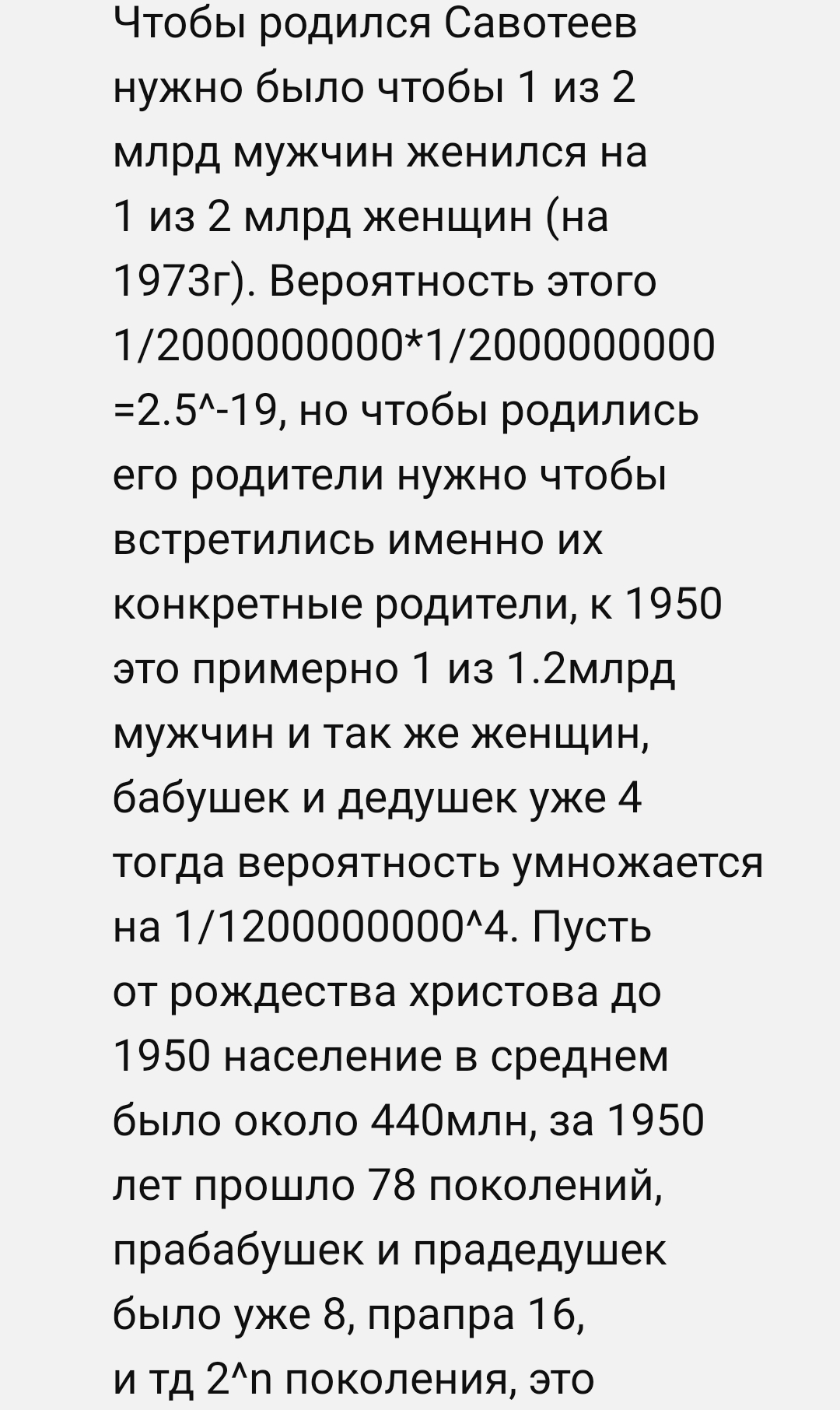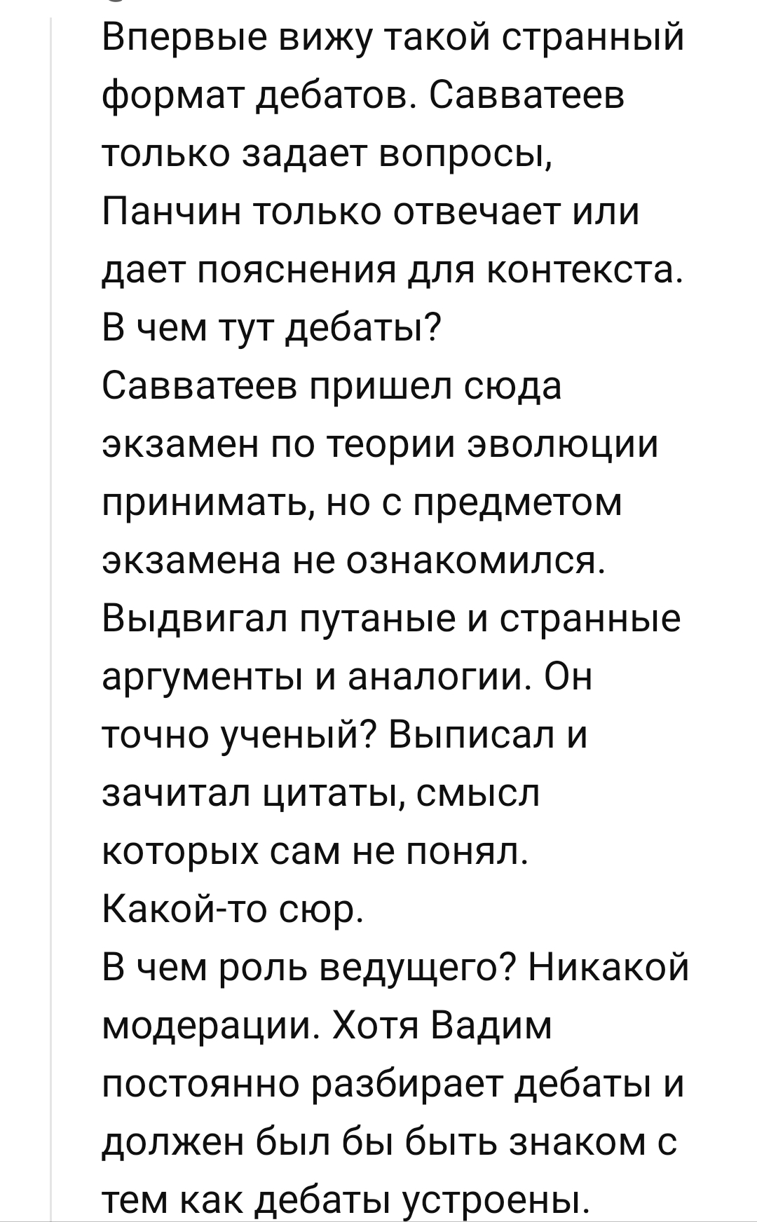 https://t.me/cognitivniynadzor/1152 Комменты по дебатам. Хз кому и почему мог савватеев понравится. Единственный внятный аргумент это низкая вероятность абиогинеща. Но низкая вероятность не равно невозможность
