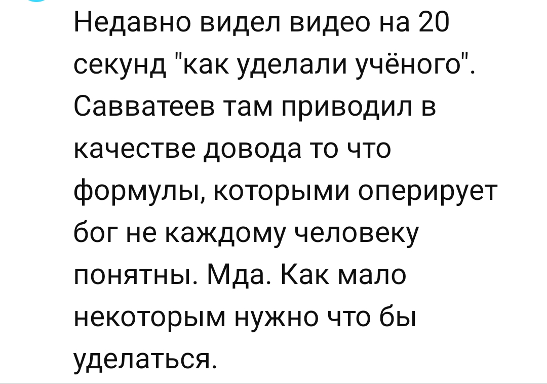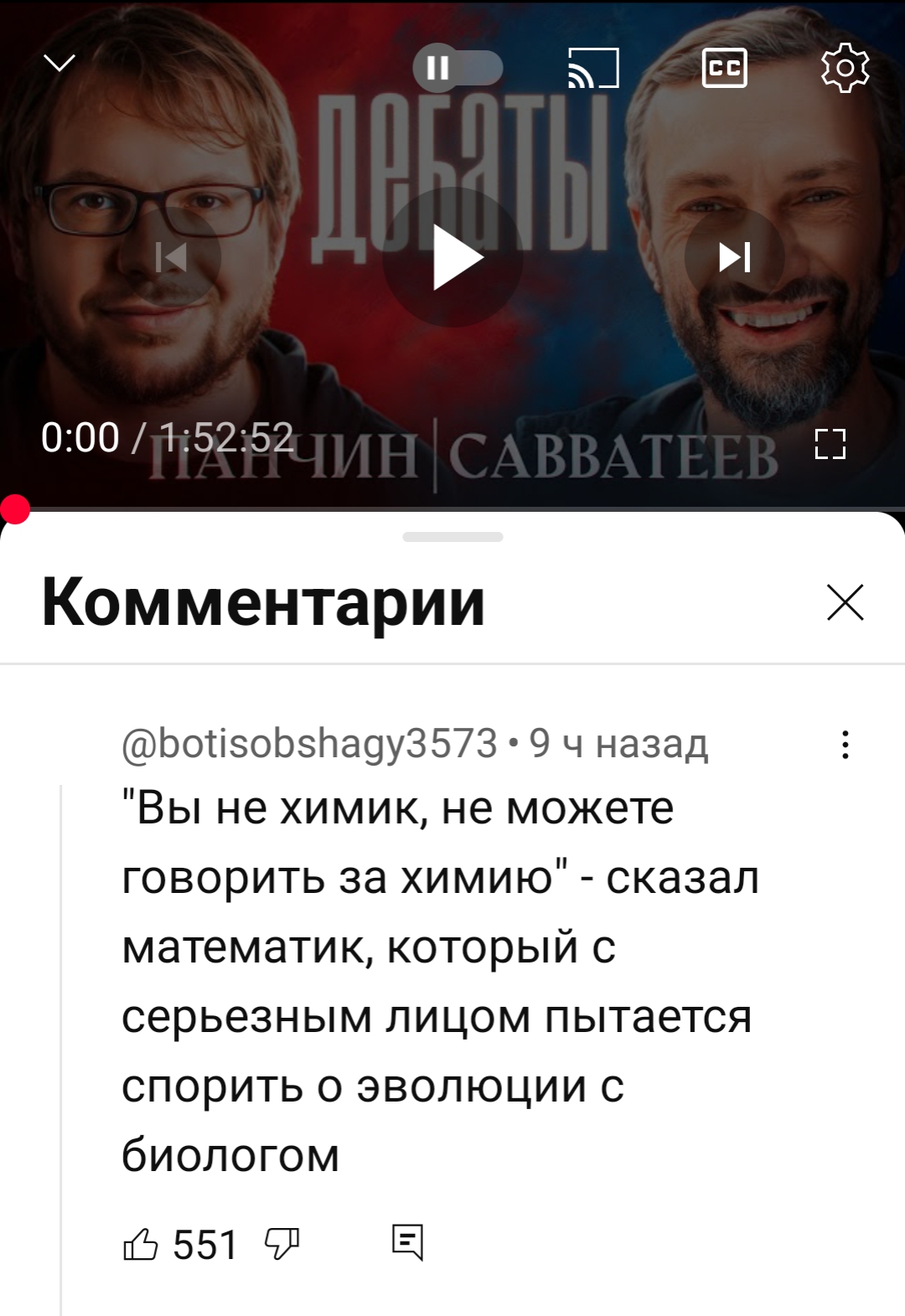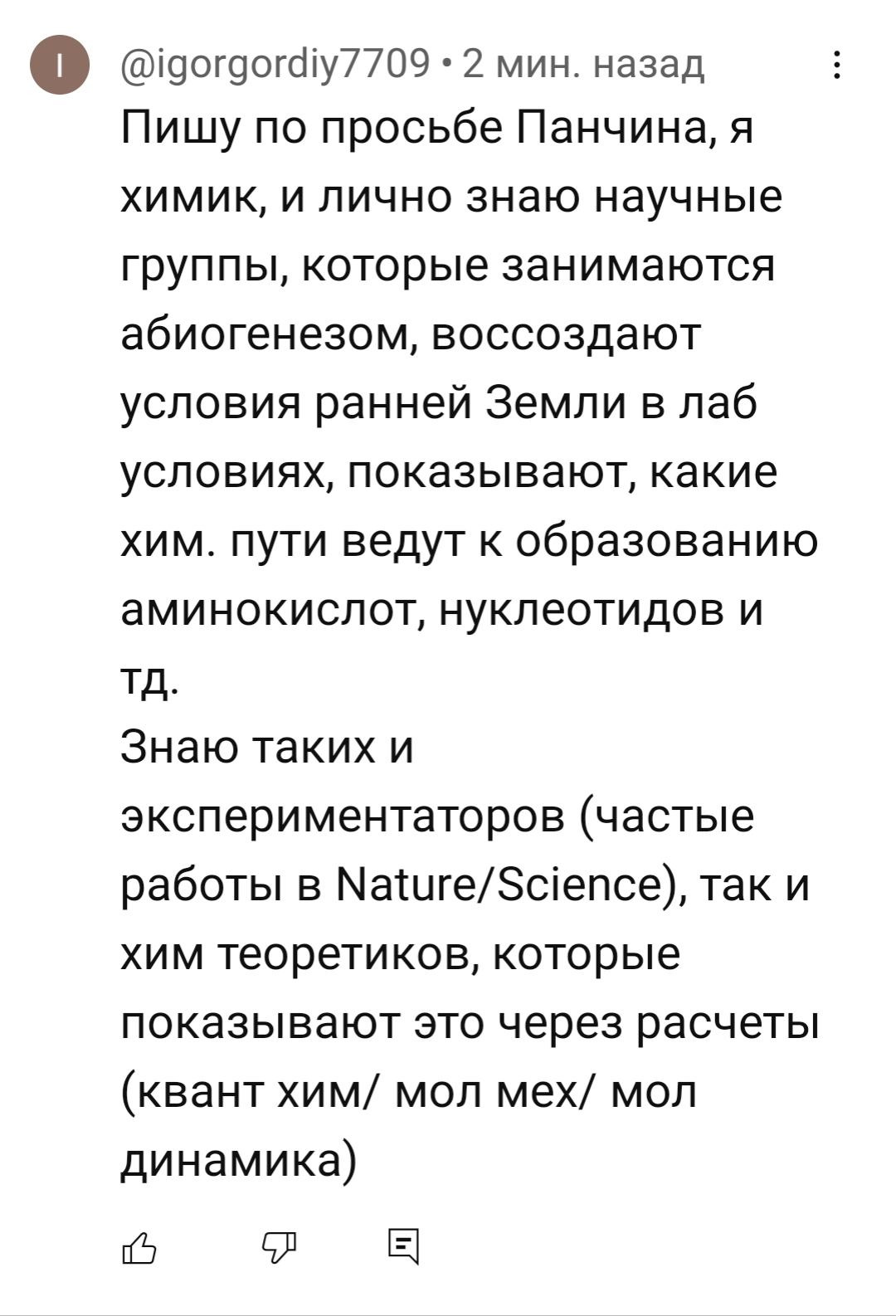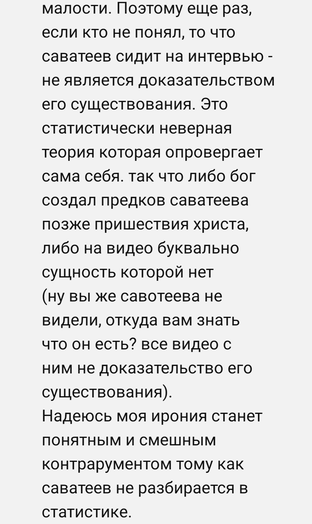 https://t.me/cognitivniynadzor/1152 Комменты по дебатам. Хз кому и почему мог савватеев понравится. Единственный внятный аргумент это низкая вероятность абиогинеща. Но низкая вероятность не равно невозможность